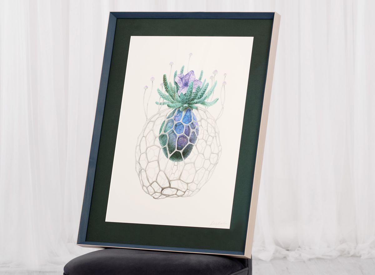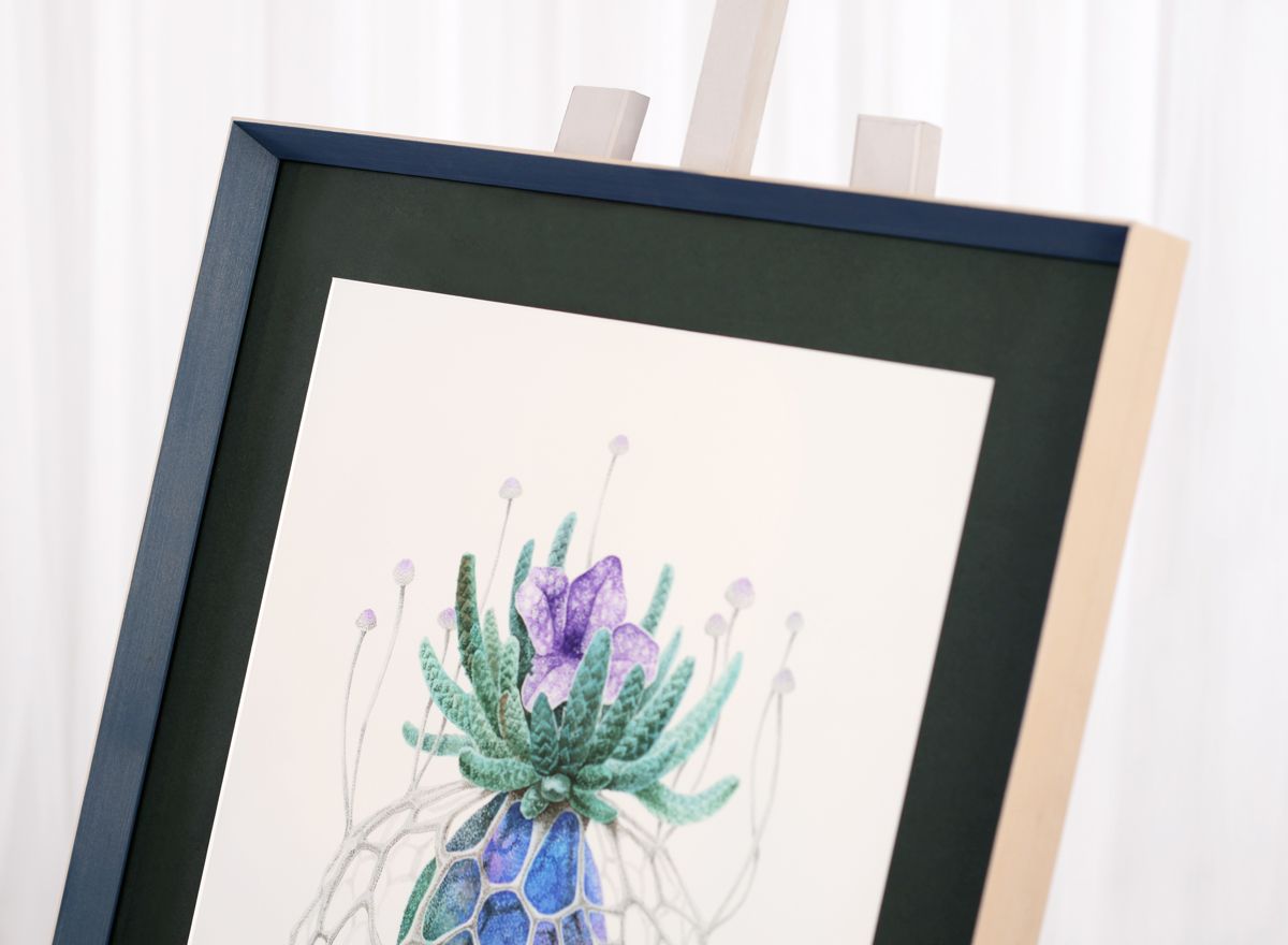 Použili jsme nádherný pěkně profilovaný dřevěný rám s velice krásnou tlustostěnnou olivovou dýhou v barvě tmavého dubu. Abychom obraz dostatečně ochránili, je podložen archivální nekyselou podložkou a od skla oddělen skrytou separační vložkou. Kvalitně vytištěné gicleé pigmentové tisky jsou naštěstí velmi odolné proti UV záření, mohli jsme tedy použít klasické antireflexní sklo s nejnižším UV filtrem na úrovni 70%, aby barvy obrazu ani jeho atmosféra nebyly ničím rušeny, ale přitom rámování bylo cenově dostupné.
