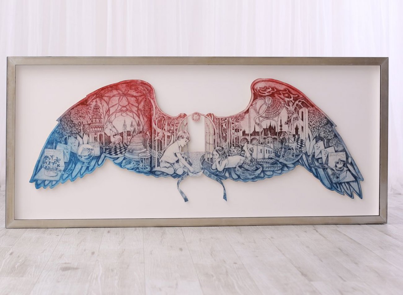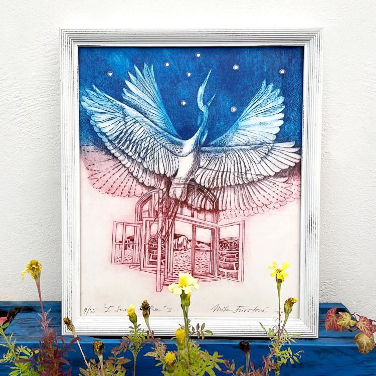 Jeden z nejvíce ikonických obrazů Míly Fürstové, který nás při rámování samozřejmě potrápil více, než ostatní jsou slavná křídla Learning to Fly. Nejsou to „ta“ Coldplay křídla, ale je to velký, barevný a jemně prořezávaný lept tvaru roztažených křídel. Před tím, než jsme obraz mohli zarámovat do krásného moderního prostorového rámu se stříbrem a černou hranou jsme jej museli pečlivě vyzdvihnout na prořezávanou podložku, aby se křídla opravdu vznášela nad paspartou. Pracné, ale výsledek stojí za to…