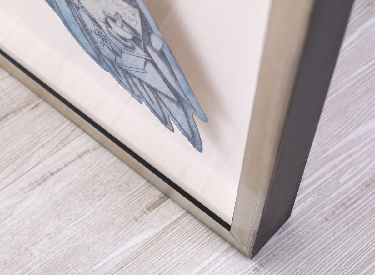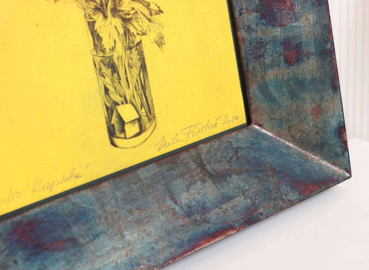 Rámování leptu jsme pojali velmi velkoryse. Sice není doplněné o paspartu, kterou jsme nahradili muzeální distanční vložkou pro oddělení leptu od galerijního antireflexního skla, ale má nepřehlédnutelný rám. Neobyčejně luxusní na zakázku vyrobený rám tvaru mohutného trojúhelníku je pokryt pravým plátkovým stříbrem, které je upraveno do opalizujících odstínů zelené, modré a červené, čímž báječně ladí s odstíny obrazu a nejenže jej barevně skvěle doplňují, ale pomáhají mu skvěle vyniknout. Právě díky tomu, jak mohutný rám je použitý, bylo možné vynechat paspartu, která by u subtilního rámečku nesměla chybět.