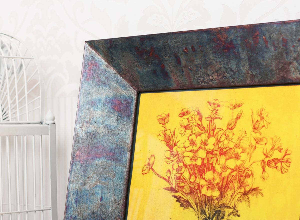 Zajímavý bílý dřevěný rám v toskánském shabby chic stylu oba tyto body samozřejmě řeší a přitom svým jemným vzhledem podtrhuje jemnost a vzletnost obrazu. Troch neobvykle je použito sklo jen s antireflexní úpravou a základní UV ochranou 70%, zatímco jinak se vzhledem k vysoké ceně obrazů Míly Fürstové používají spíše galerijní antireflexní skla s UV filtrem nad 90% či muzeální skla s nejúčinnějším UV filtrem 99%.