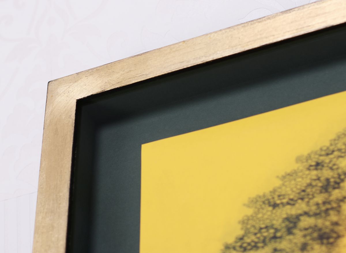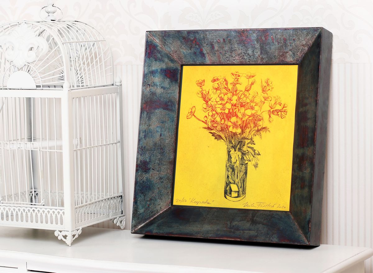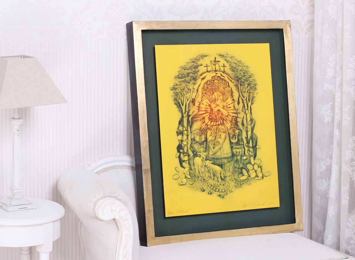 Obraz „Poklad“ jsme rámovali jako by to poklad skutečně byl – na zakázku jsme pro něj vyrobili hluboký rám s vyzlacenou přední stranou a černým bokem, doplnili jej o elegantní tmavozelenou paspartu a obraz umístili do poloviny hloubky rámu, takže vypadá, jako by se v něm jen vznášel. Proti světlu jej chrání kvalitní galerijní antireflexní sklo s UV filtrem 92%. Takto zarámovaný může lept viset v podstatě v každém interiéru.