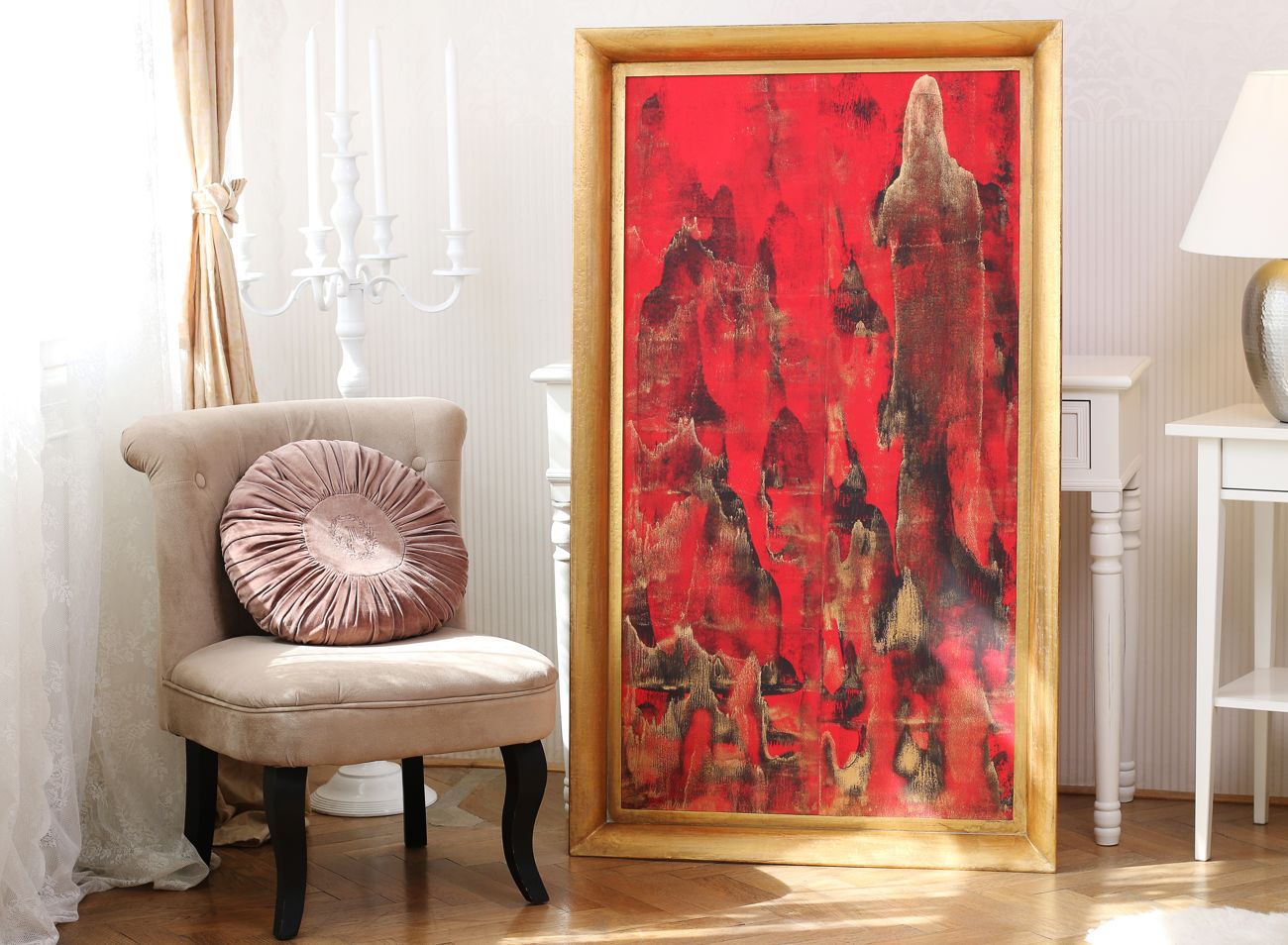 Mohutný na zakázku vyrobený modelový rám s tvarem hlubokého oblouku, s ručním zlacením, drásáním, uzavřenými rohovými spoji a ušlechtilou patinou by jen málokdo nazval galerijním rámováním. Jenže tahle adjustace je zcela uchvacující a těžko si představit, jak nevýrazná by bylo zarámování do jednoduché lišty.
