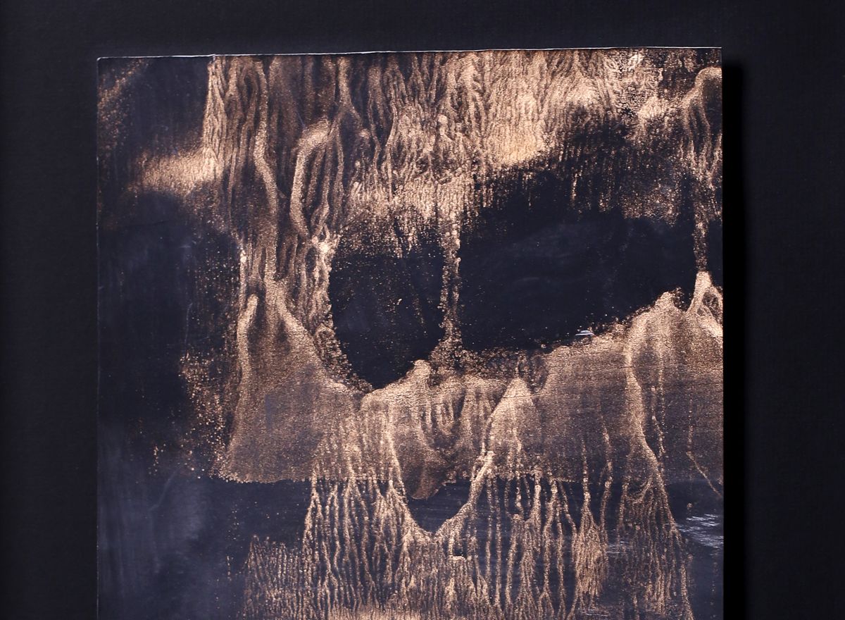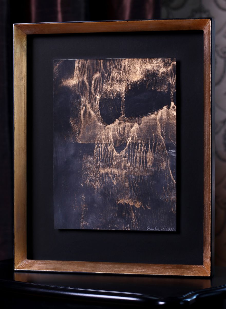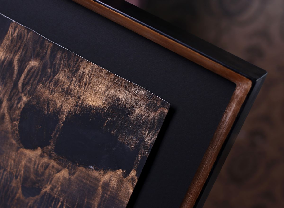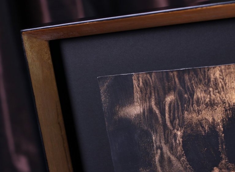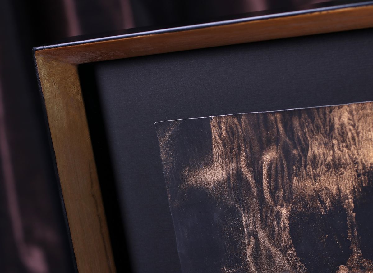 Prostorový efekt adjustace tentokrát umocňuje i špičkový zakázkový rám v moderním vysokém, do špičky tvarovaném provedení. Tmavé, teple patinované zlato spolu s černou vnější hranou a hluboce černou paspartou tvoří skvělou harmonii s obrazem a nechává vyniknout každému detailu jeho struktury.