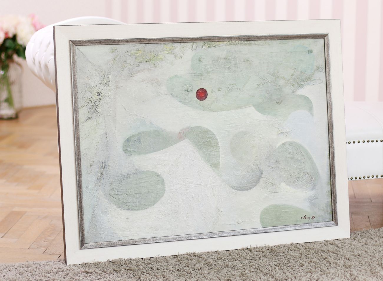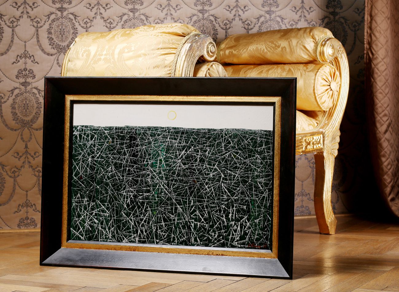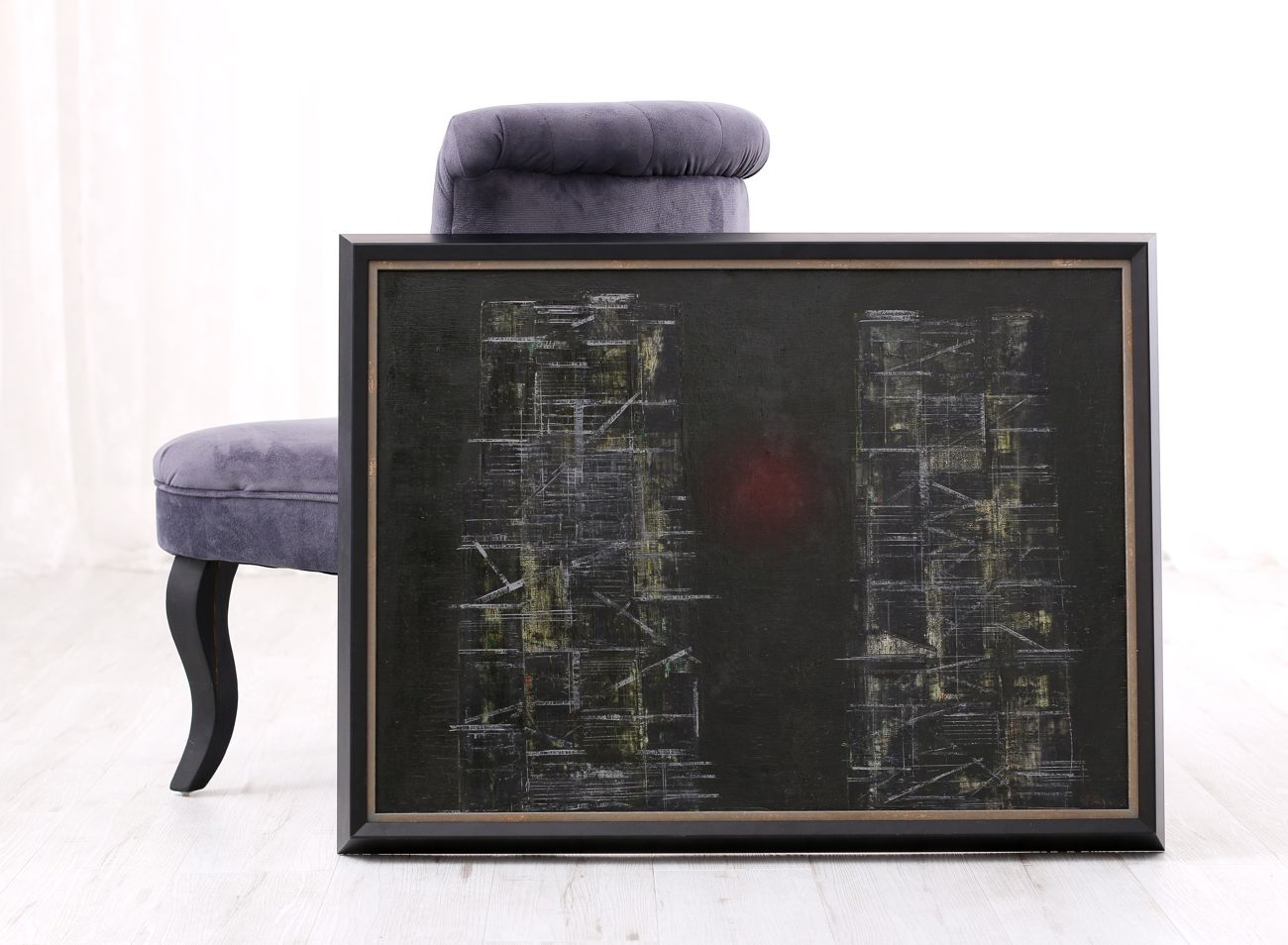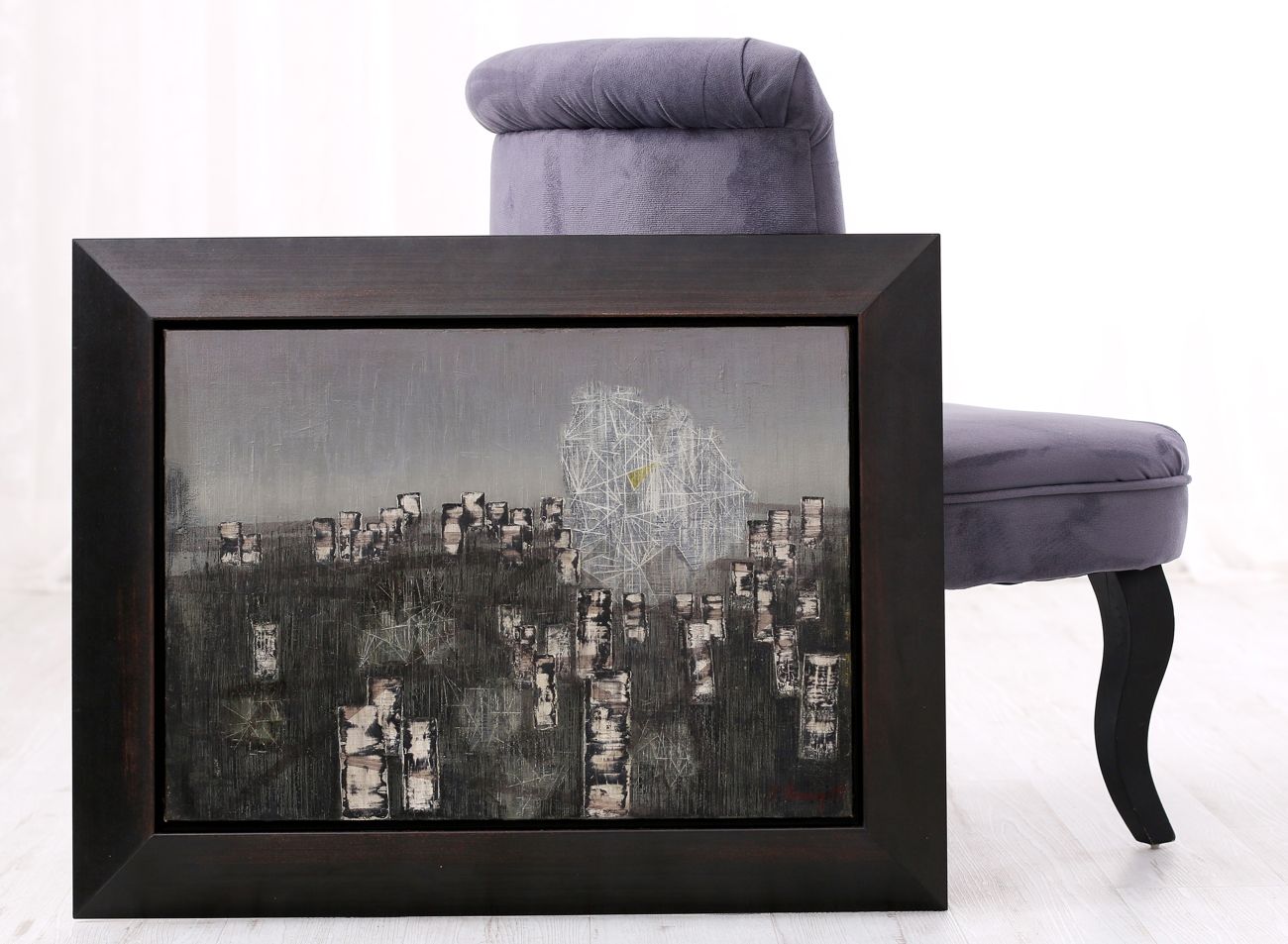 Bylo důležité, aby rámování menší plátno z cyklu krystalů nad městem nijak neomezovalo a zároveň mu dodávalo dostatečnou velikost. Proto jsme pro obraz volili jednoduchý, moderní plovoucí rám v elegantní černo-hnědé barvě. Oproti dalším typově podobným rámům je tento ale velmi široký, navíc se zajímavým trojúhelníkovým tvarem a k obrazu dokonale padne.