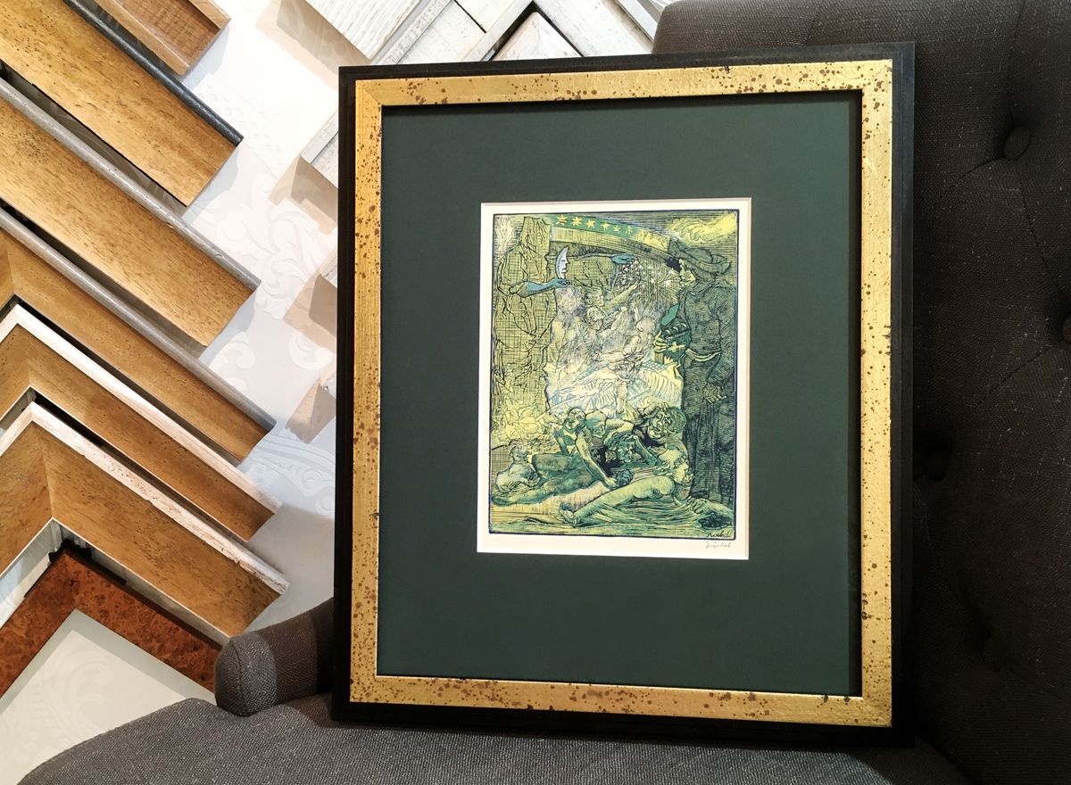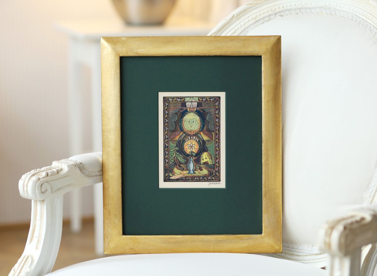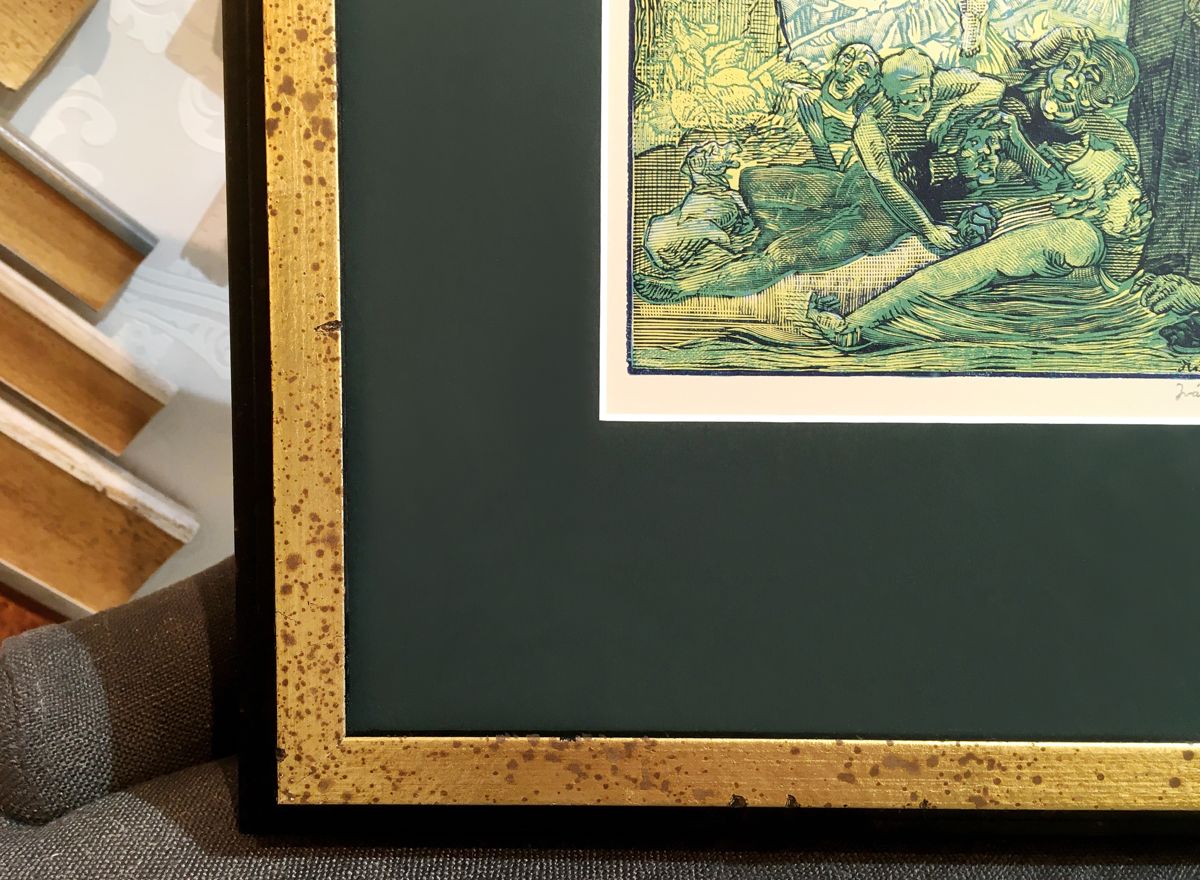 K zlatavým a zelenavým tónům obrazu se skvěle hodí jemný dřevěný italský rám v dokončení patinovaného zlata s černým bokem, protože ještě více podpoří jemné barevné detaily tisku. Rámování je doplněné o elegantní zelenou muzeální paspartu a kvalitní antireflexní sklo s vysokým UV filtrem, které chrání dílo před slunečním zářením.