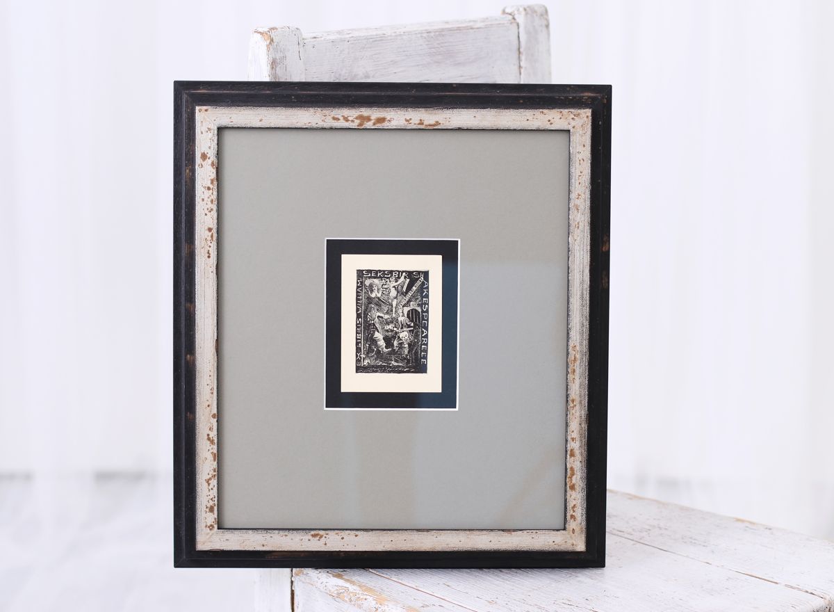 Ex libris William Seksbír je plné jazykových hrátek na příjmení Seksbír a tedy i témat ze Shakespearových her. My jsme pro obraz vybrali dvojici paspart – spodní černou, která obraz jen jemně orámuje a hlavní střední šedou a ty následně jsme doplnili o zajímavý stupňovitý rám v kombinaci černé patiny a starého stříbra s efektem času.