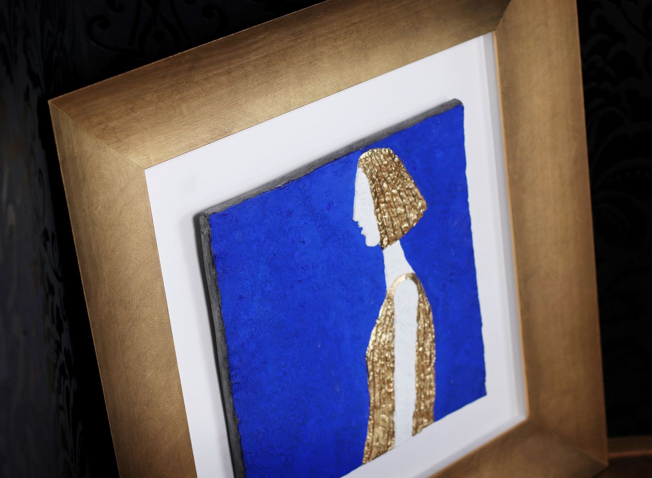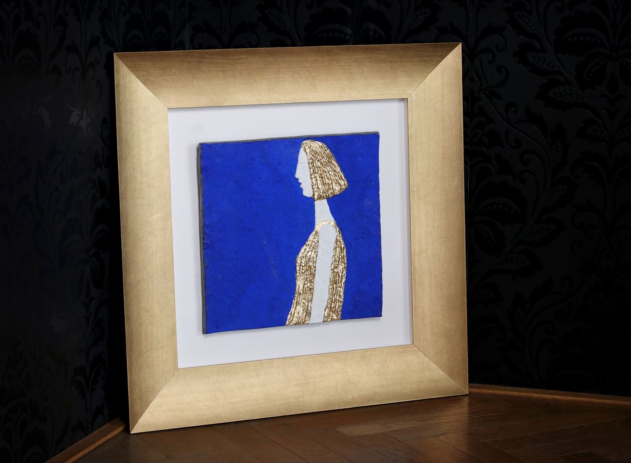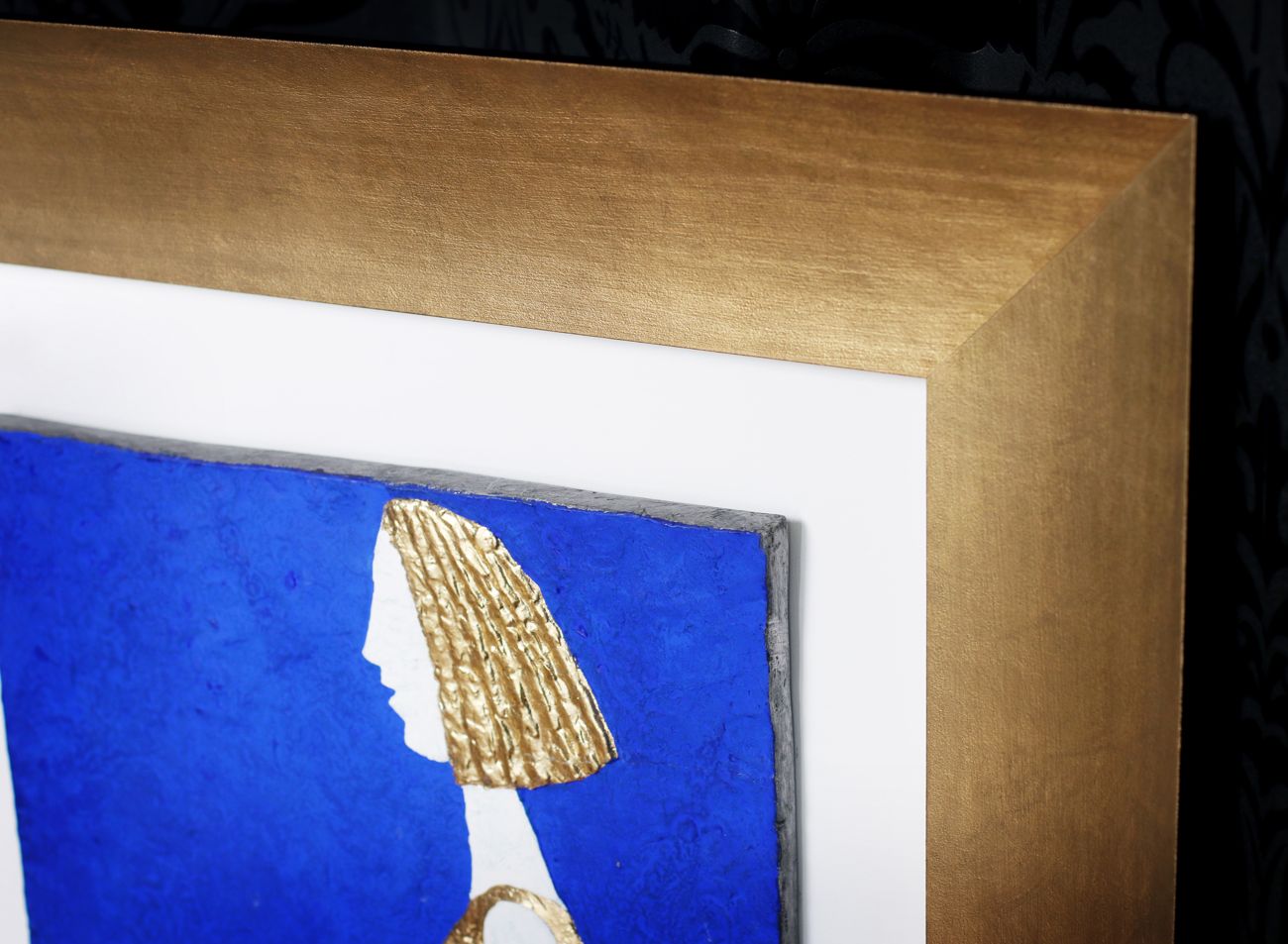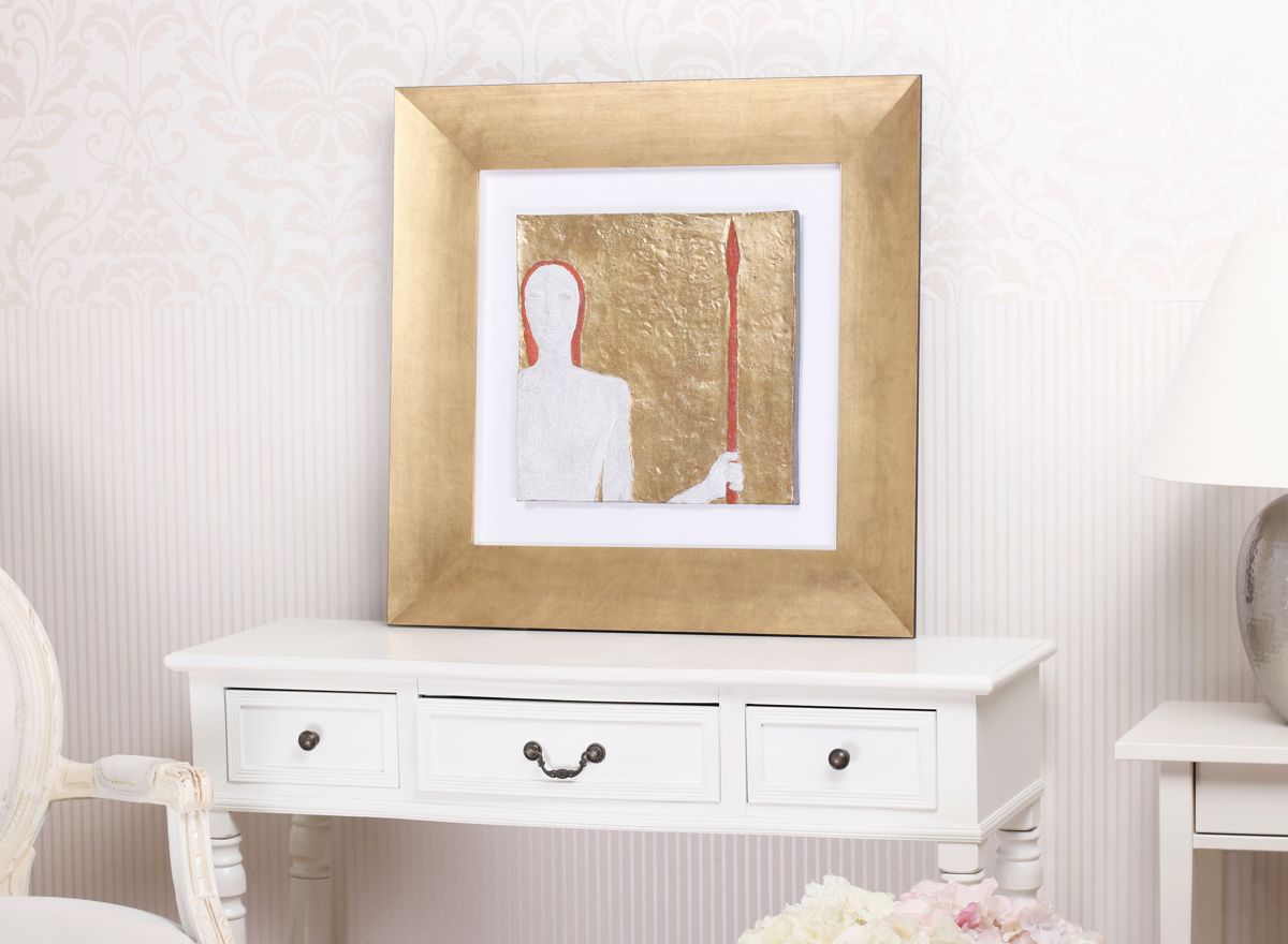 Hlubší nestejnoměrně zlacený rám dokáže i velmi nerovný obraz bez problémů pojmout a jeho zlacení, téměř s identické se zlatem použitým v obrazu dokonale podpoří zvýrazněnou část díla. Díky výrazné hloubce rámu má je dílo vzdušné a působí velice elegantně.