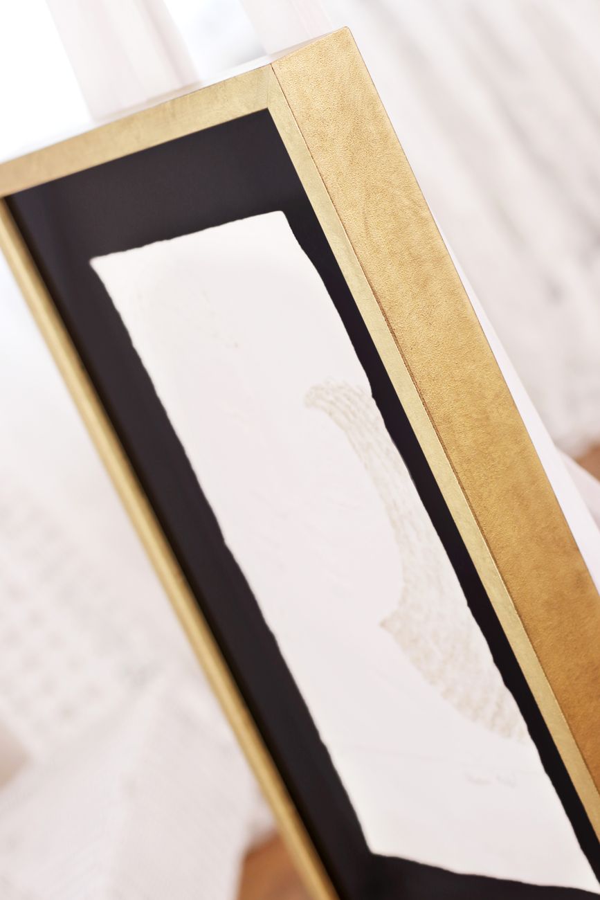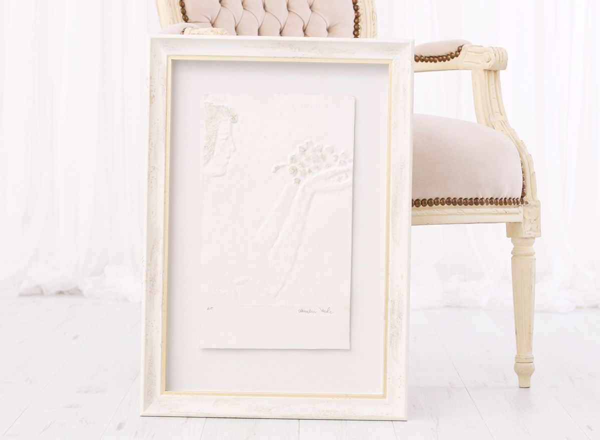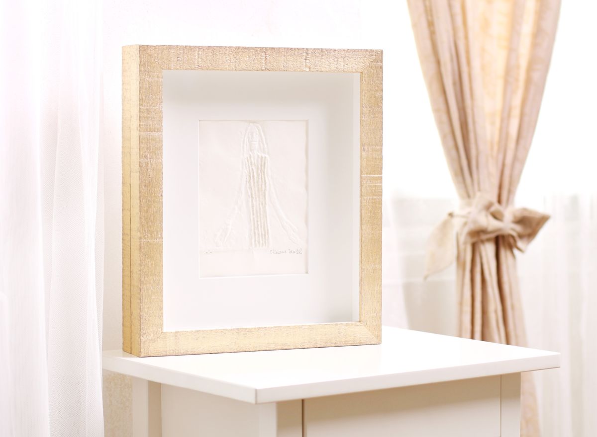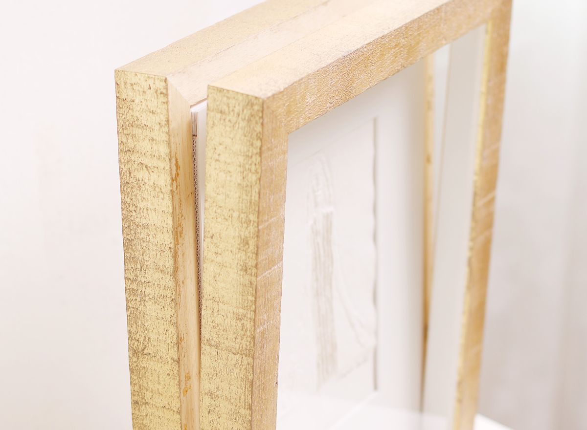 Velká většina reliéfních tisků Olbrama Zoubka, které se u nás objevují k zarámování, je částečně zlacena. Vzniká tak jedinečná kombinace nejen struktur, ale i souhra bílé barvy ručního papíru a zlatého pigmentu. Jeden z nejkrásnějších způsobů rámování reliéfních tisků sází právě na využití a dalším znásobení tohoto krásného efektu.