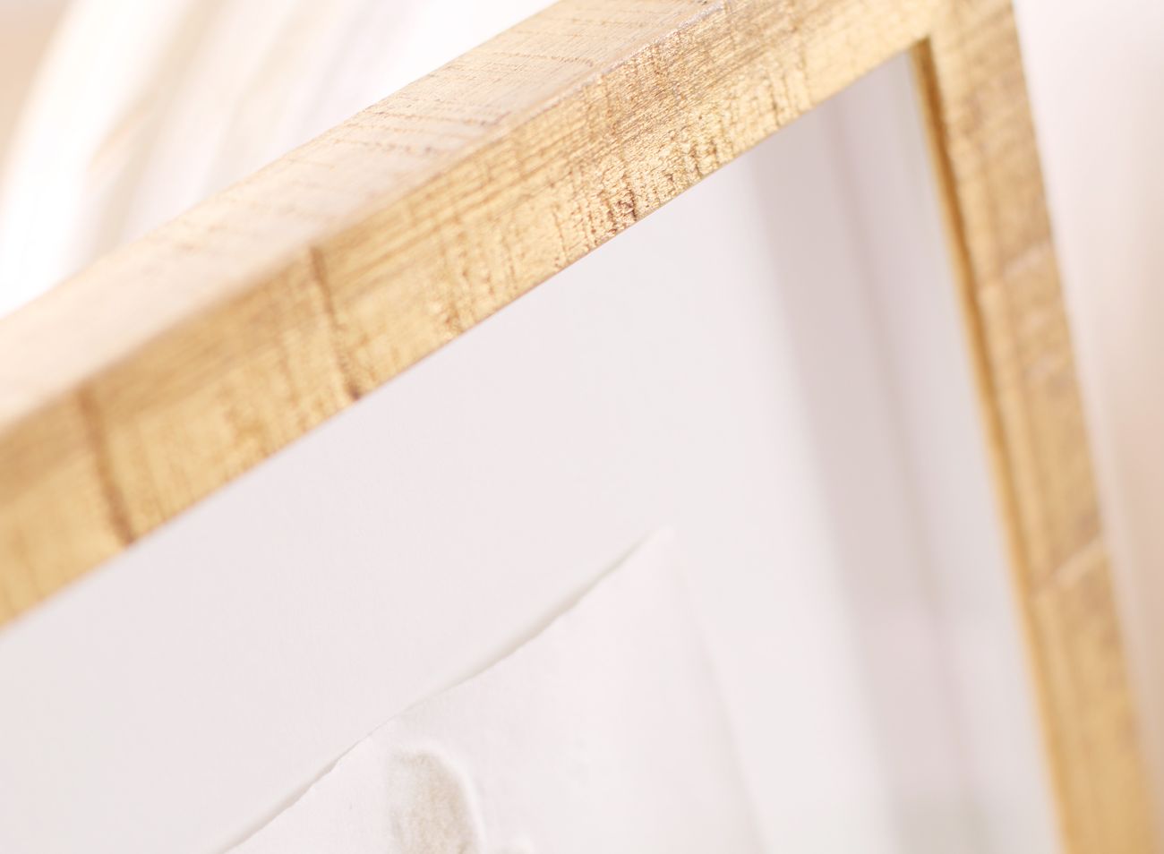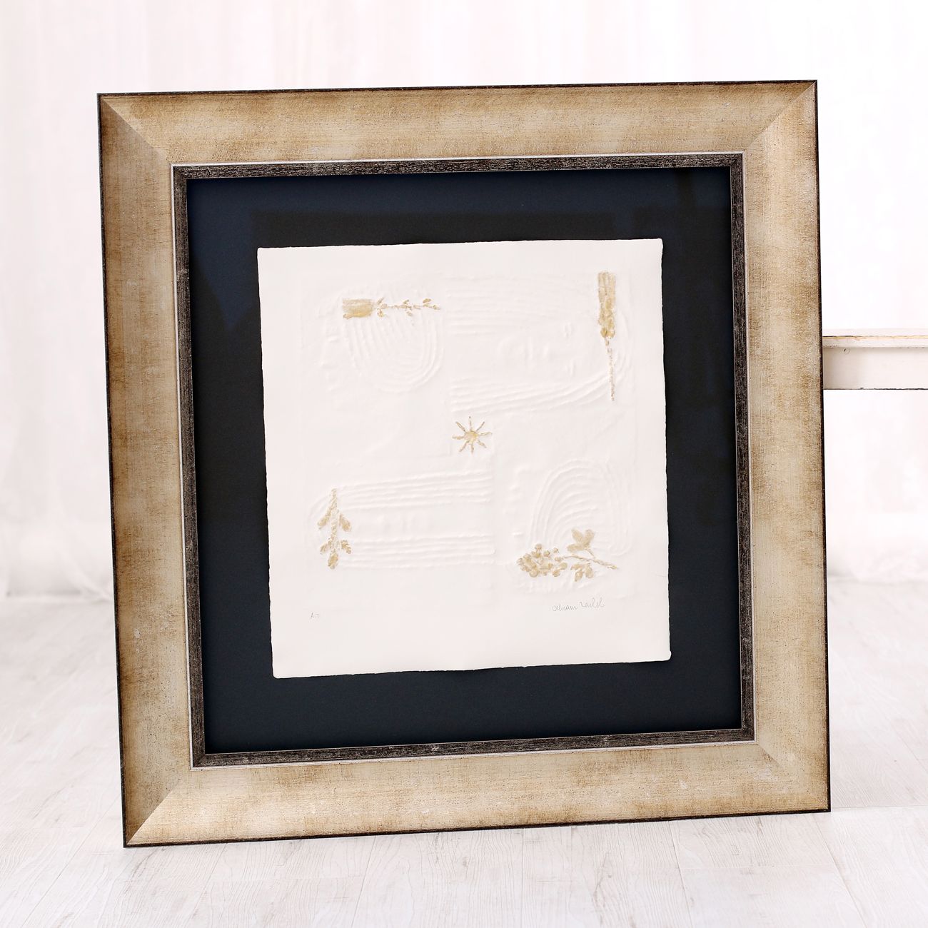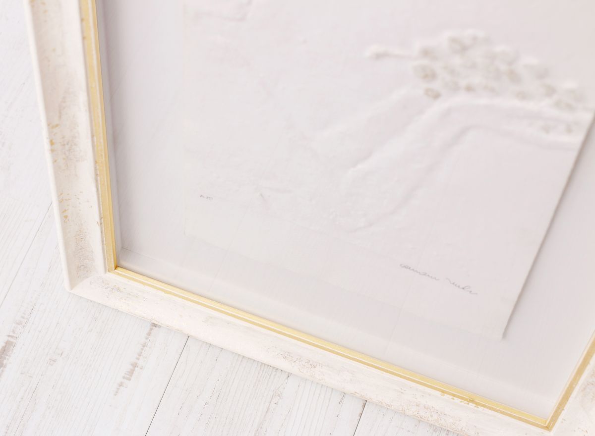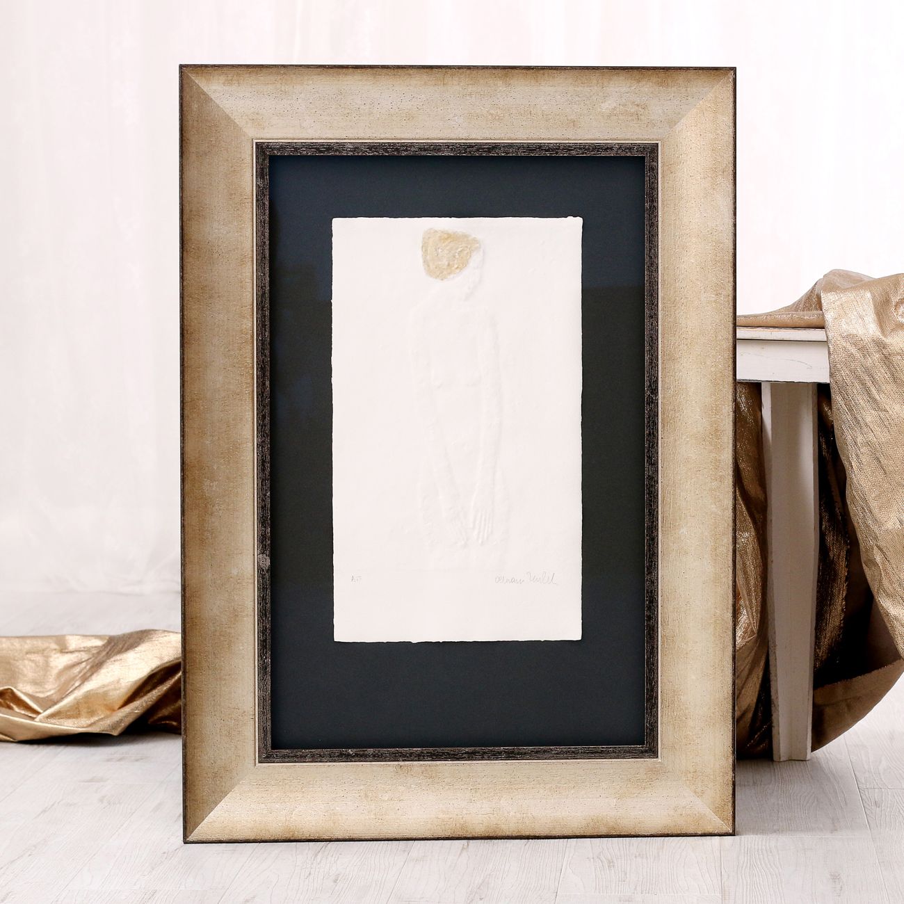 Velká většina reliéfních tisků Olbrama Zoubka, které se u nás objevují k zarámování, je částečně zlacena. Vzniká tak jedinečná kombinace nejen struktur, ale i souhra bílé barvy ručního papíru a zlatého pigmentu. Jeden z nejkrásnějších způsobů rámování reliéfních tisků sází právě na využití a dalším znásobení tohoto krásného efektu.