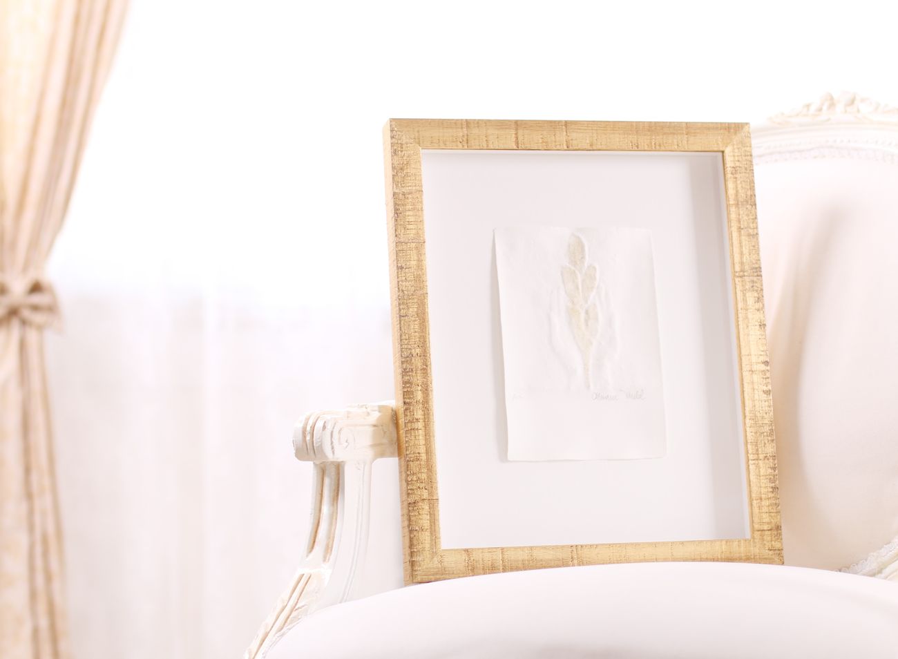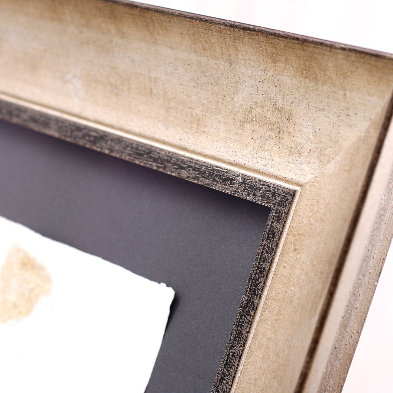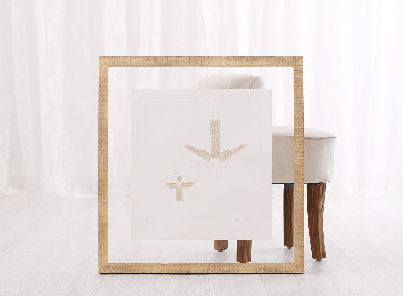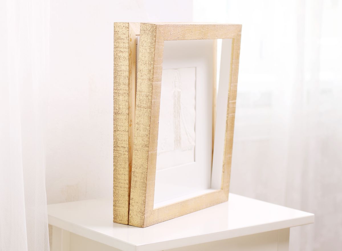 Velká většina reliéfních tisků Olbrama Zoubka, které se u nás objevují k zarámování, je částečně zlacena. Vzniká tak jedinečná kombinace nejen struktur, ale i souhra bílé barvy ručního papíru a zlatého pigmentu. Jeden z nejkrásnějších způsobů rámování reliéfních tisků sází právě na využití a dalším znásobení tohoto krásného efektu.