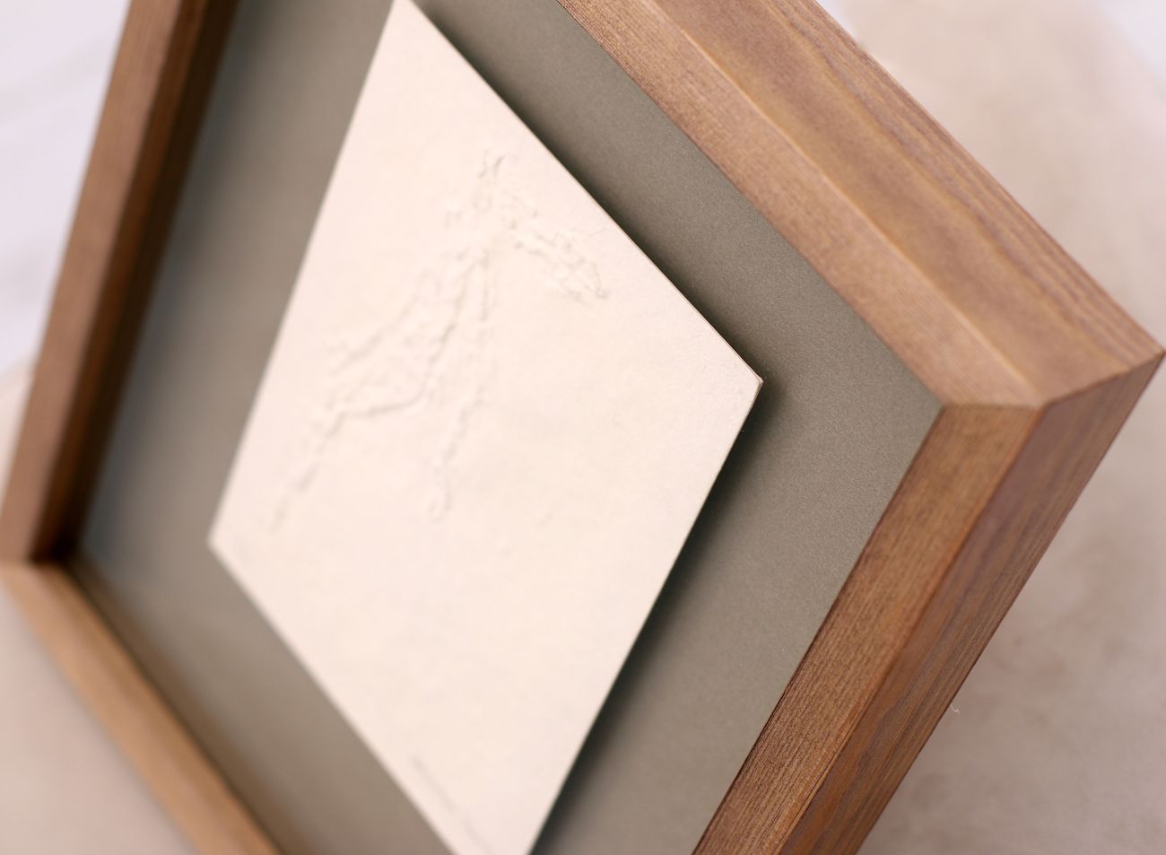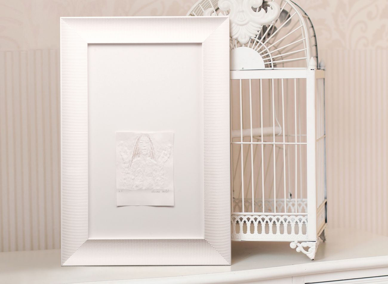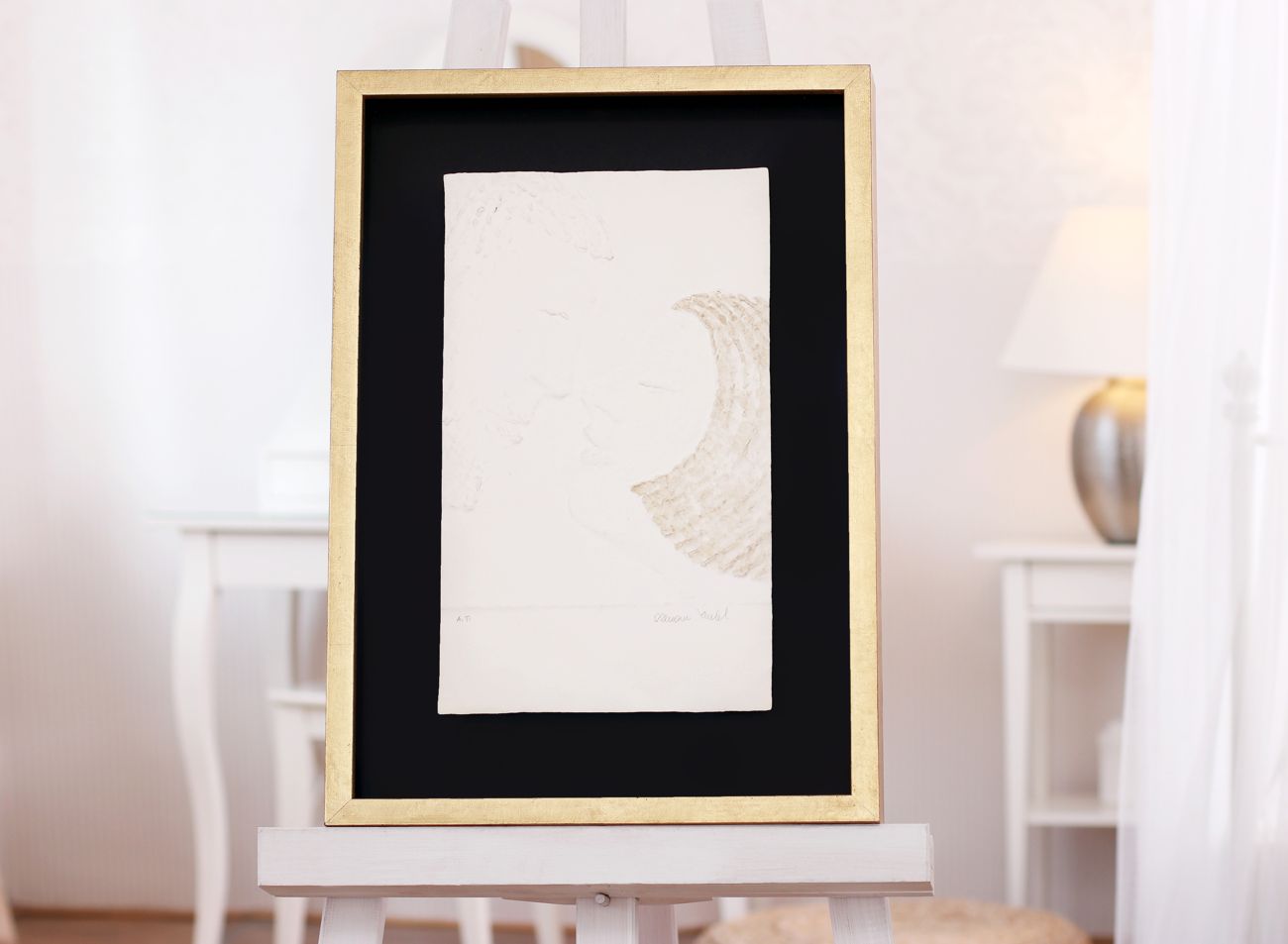 Prostorové rámování do zlatého elegantního rámu s bílým podkladem sluší nejen menším reliéfním tiskům, ale samozřejmě i těm mnohem větším. V porovnání jsou zde malá grafika Ruce s ratolestí s dvojnásobným reliéfním tiskem Andělé.
