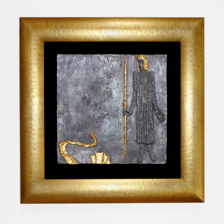 Olbram Zoubek, Prsa Achillova, cínový reliéf s polychromií a zlacením, 35 x 35 cm, 1985