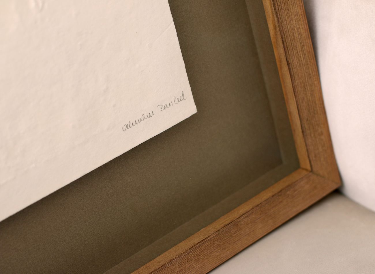 Surové přírodní dřevo i výrazněji barevné pasparty se při rámování obrazů Olbrama Zoubka objevují poměrně zřídka. Tato konkrétní strukturální grafiky ale patří mladé sběratelce a bylo tedy důležité vyvarovat se obvyklým a usedlejším způsobům rámování. Tentokrát je tedy rámeček z krásné přírodní švédské borovice doplněn o jemně zelenou paspartu. Přestože se jedná o netypickou kombinaci, výsledek je elegantní a svěží.