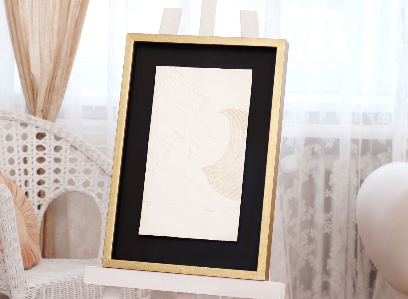 Protože jsou pravdu těžké a nemívají rovnou základu ani zcela pravidelné tvary, je vhodné využít rám jen jako podklad a reliéf zavěsit samostatně. Stejně je tomu v případě reliéfu Archanděl Michael, kde mohutný zlatý rám s temně černou zakázkovou paspartou i reliéf jsou jen volně propojeny.
