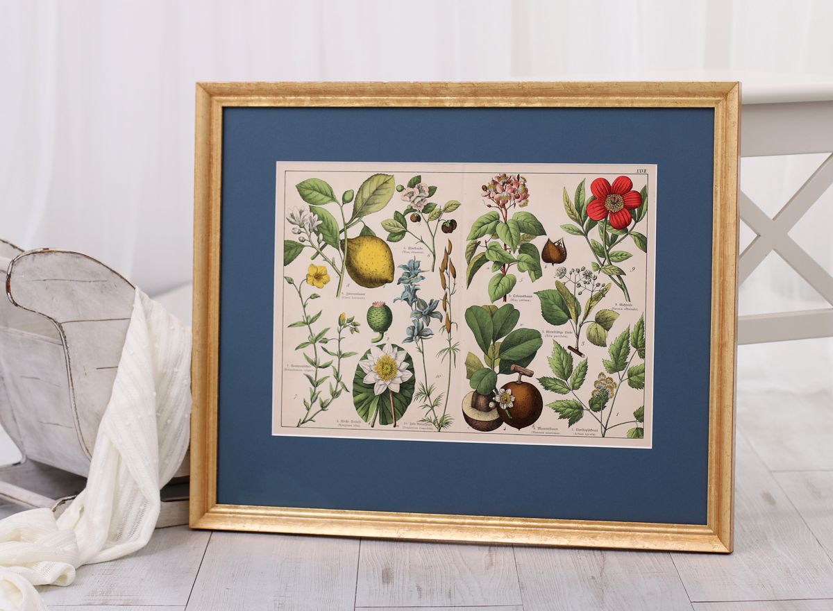 Naše květiny a plody z tisku Naturgeschichte des Pflanzenreichs (cca 1854), které vytvořil Gotthilf Heinrich Schubert, jsme v našem ateliéru Frame-it.cz paspartovali do elegantní tmavomodré pasparty a jemně profilovaného zlaceného rámečku. Tato kombinace nechá tisk nádherně vyniknout, zatímco konzervační kvalita materiálů zaručí, že mu nebude po dlouhá léta nic hrozit. Odstín modré jsme zvolili tak, aby neodpovídal žádné barvě přímo na listu, ale přitom harmonicky ladil s každým jeho detailem.