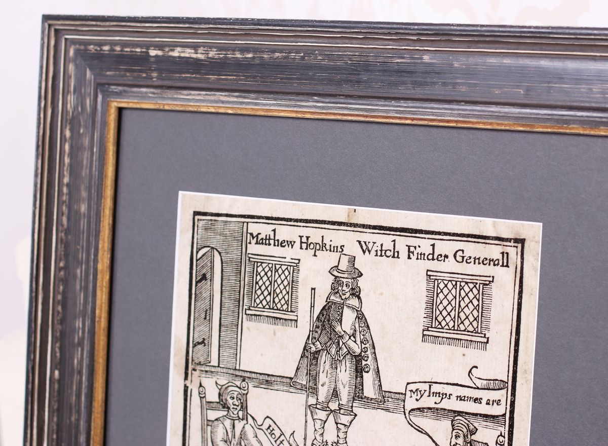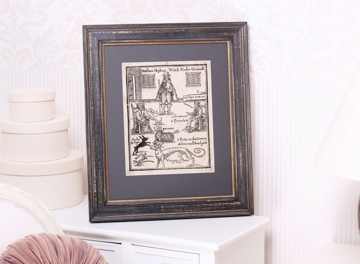 Přestože si většina z nás při pojmu hon na čarodějnice vybaví především Kladivo na čarodějnice nebo procesy v Salemu, i Anglie měla svého vyhlášeného lovce. Matthew Hopkins, autor knihy The Discovery of Witches (1647), je zodpovědný za stovky zmařených životů. Protože tento titul ani jeho autor nejsou u nás neznámí, objevila se titulní ilustrace z této knihy k zarámování i v našem pražském ateliéru Frame-it.cz.