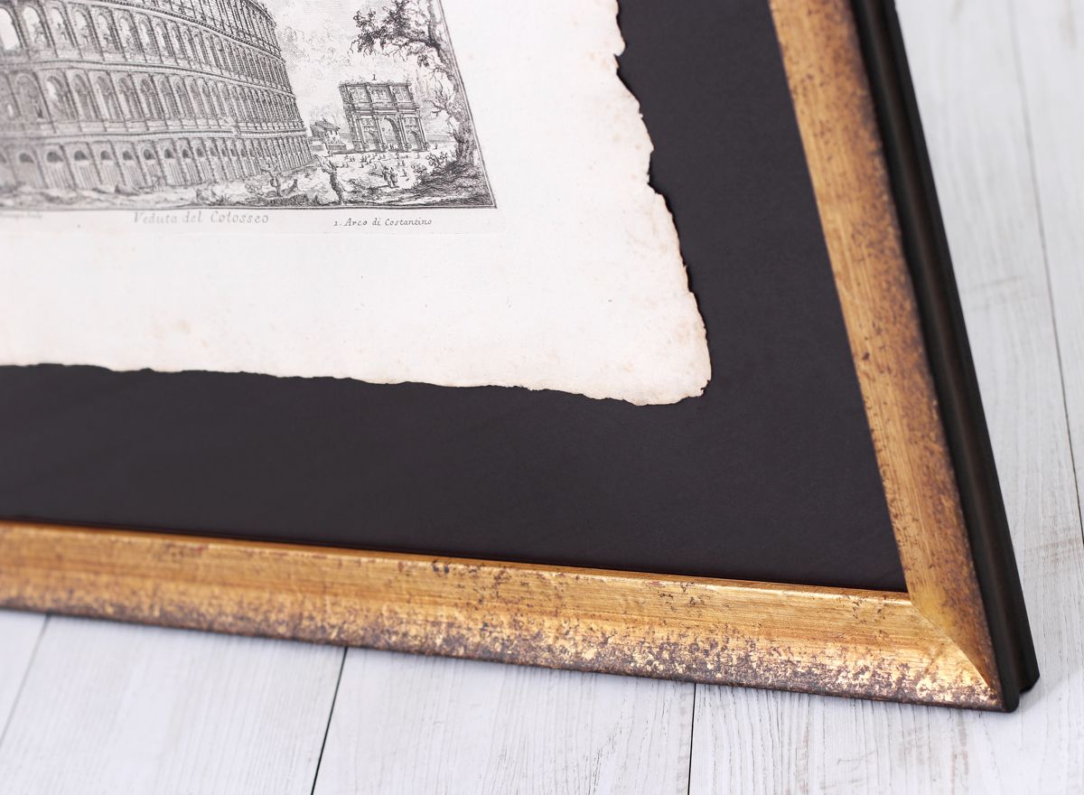 List je zasazen do elegantní šedé pasparty, která dává vyniknout černobílé kresbě. Hlavní dominantou je však patinovaný italský rám s ručně vyráběným povrchem. Jde o kombinaci černé barvy, která je ručně kartáčovaná na světlý podklad a následně patinovaná voskem. Výsledek působí autenticky, jako by rám i tisk skutečně pamatovaly staletí – skoro by se dalo říci „radost pohledět“.