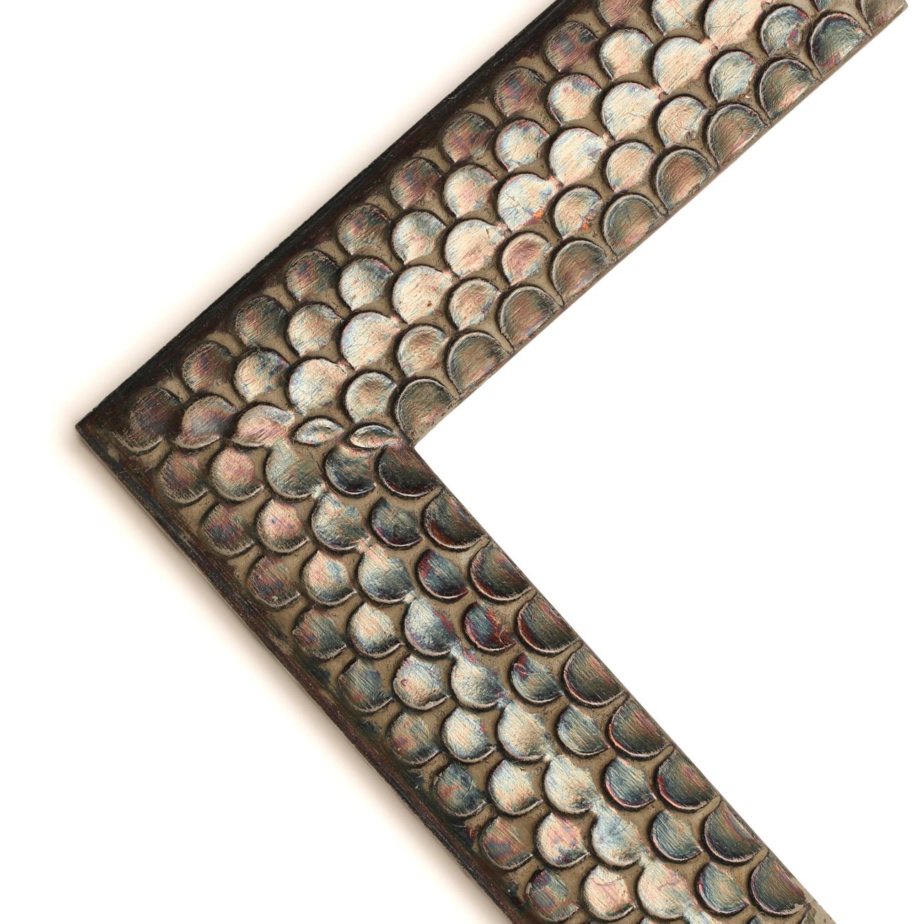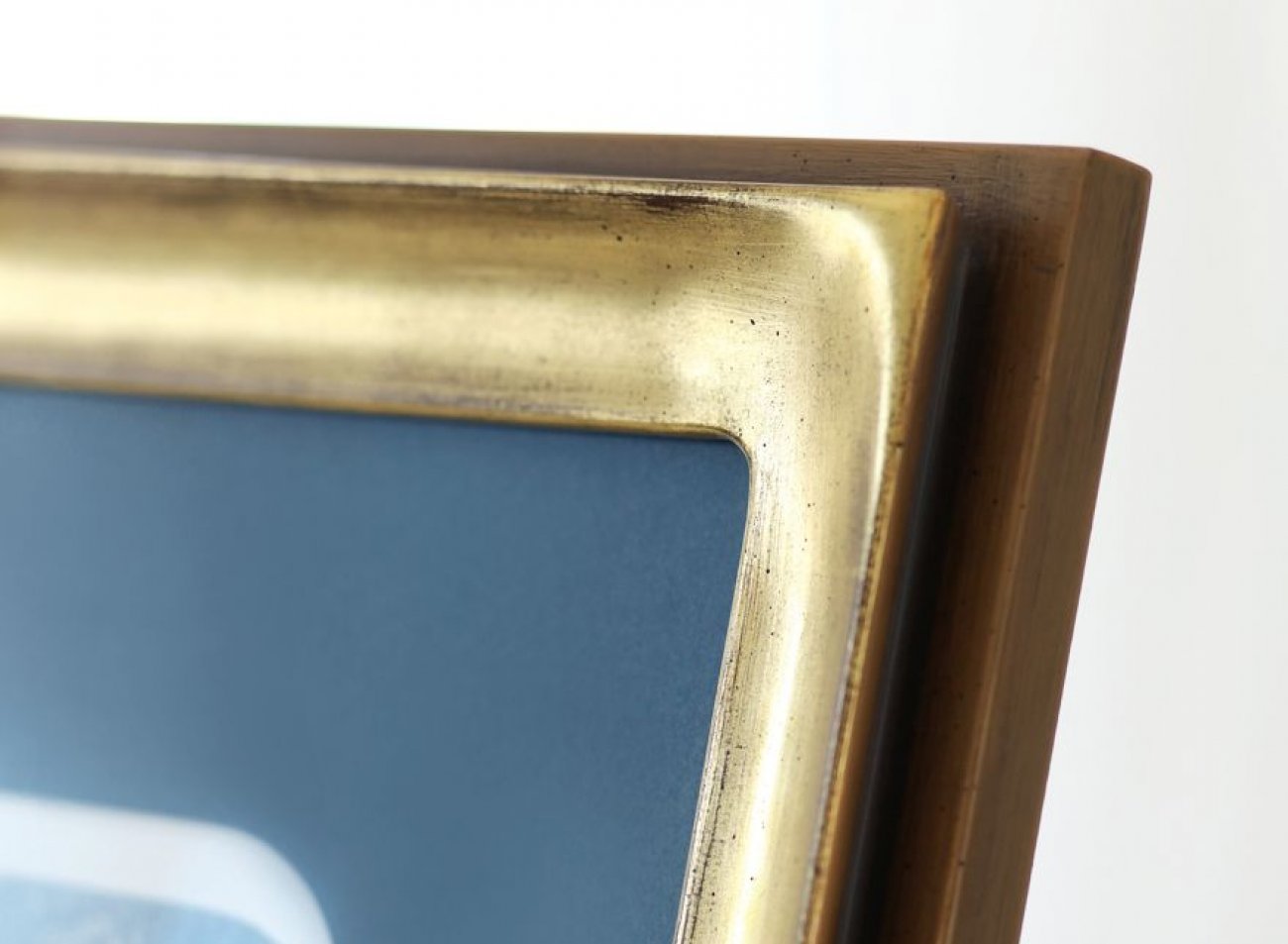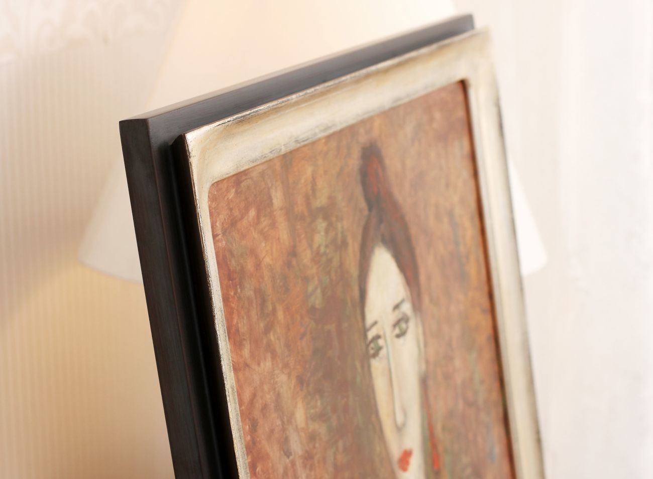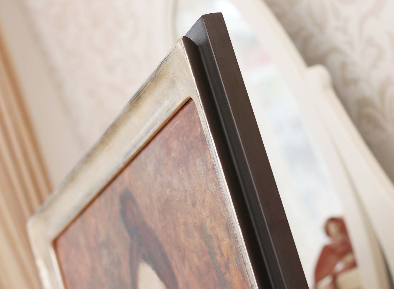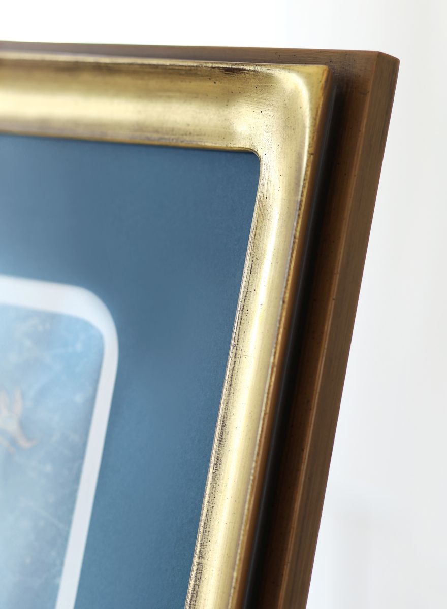 Úchvatný modelový rám má moderní tvar černo-hnědého hranolu kombinovaný s půlobloukem z pravého stříbra. V rámu se snoubí moderní tvar s tradicí a mistrovskou prací v ověřených řemeslných postupech zlacení pravým stříbrem, čistě uzavřenými rohy rámu a neobvyklými do kulata vypracovanými vnitřním rohy rámu.