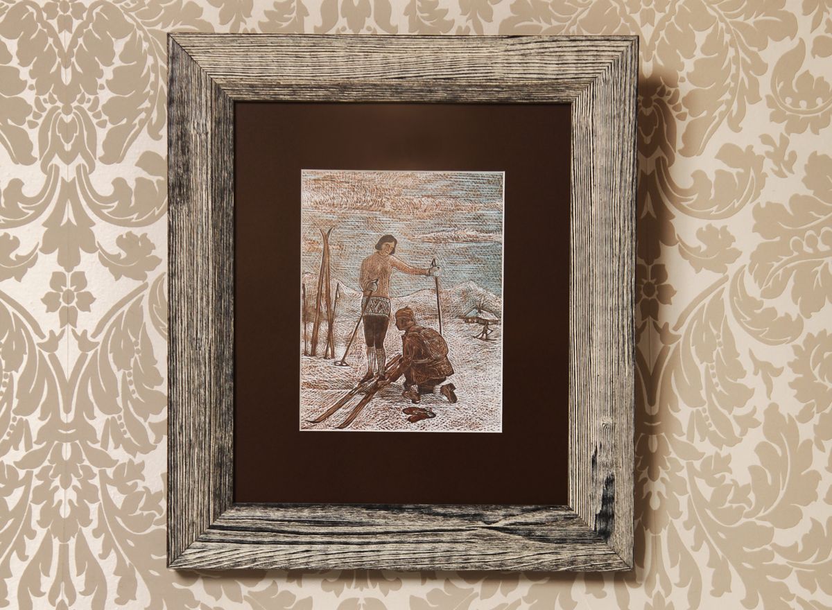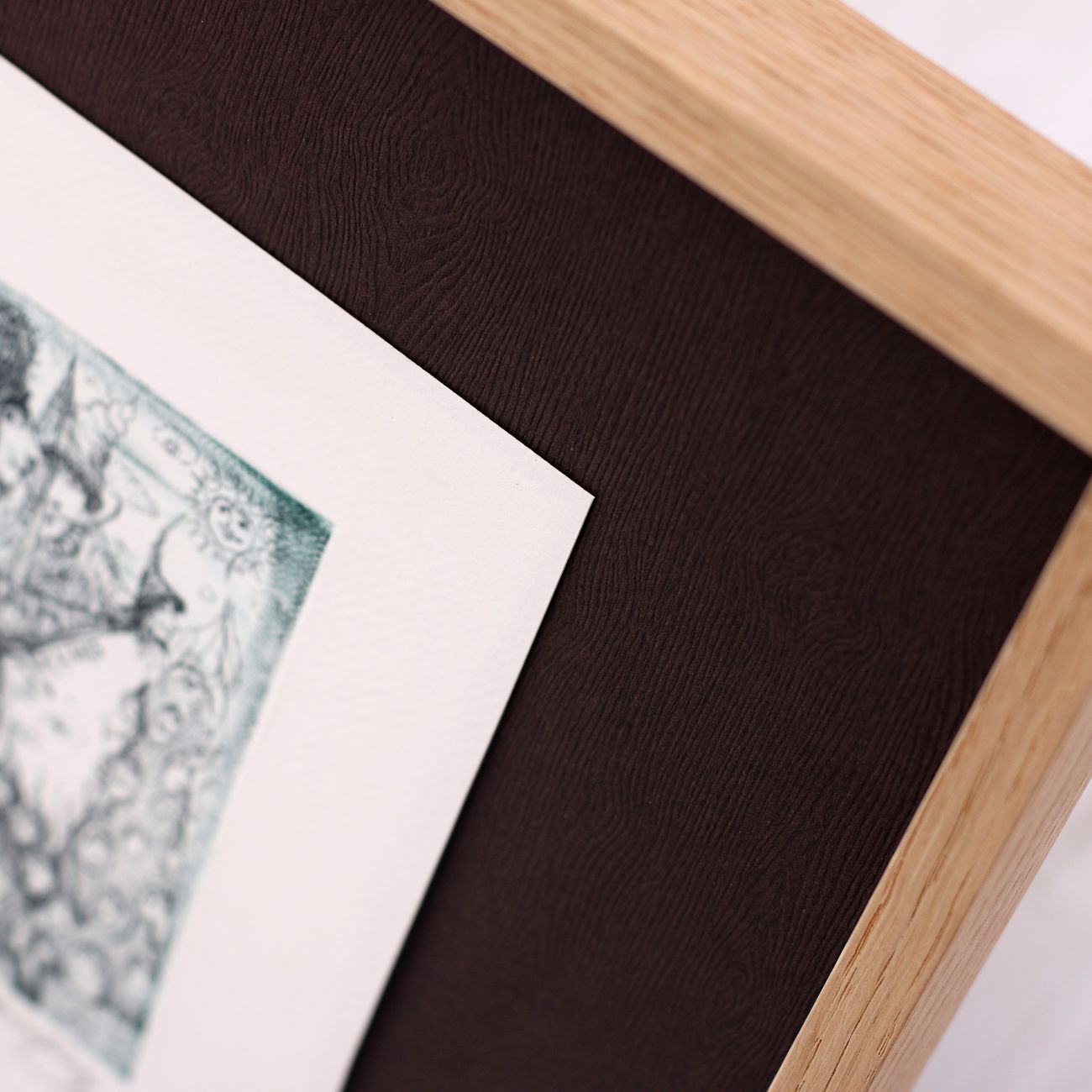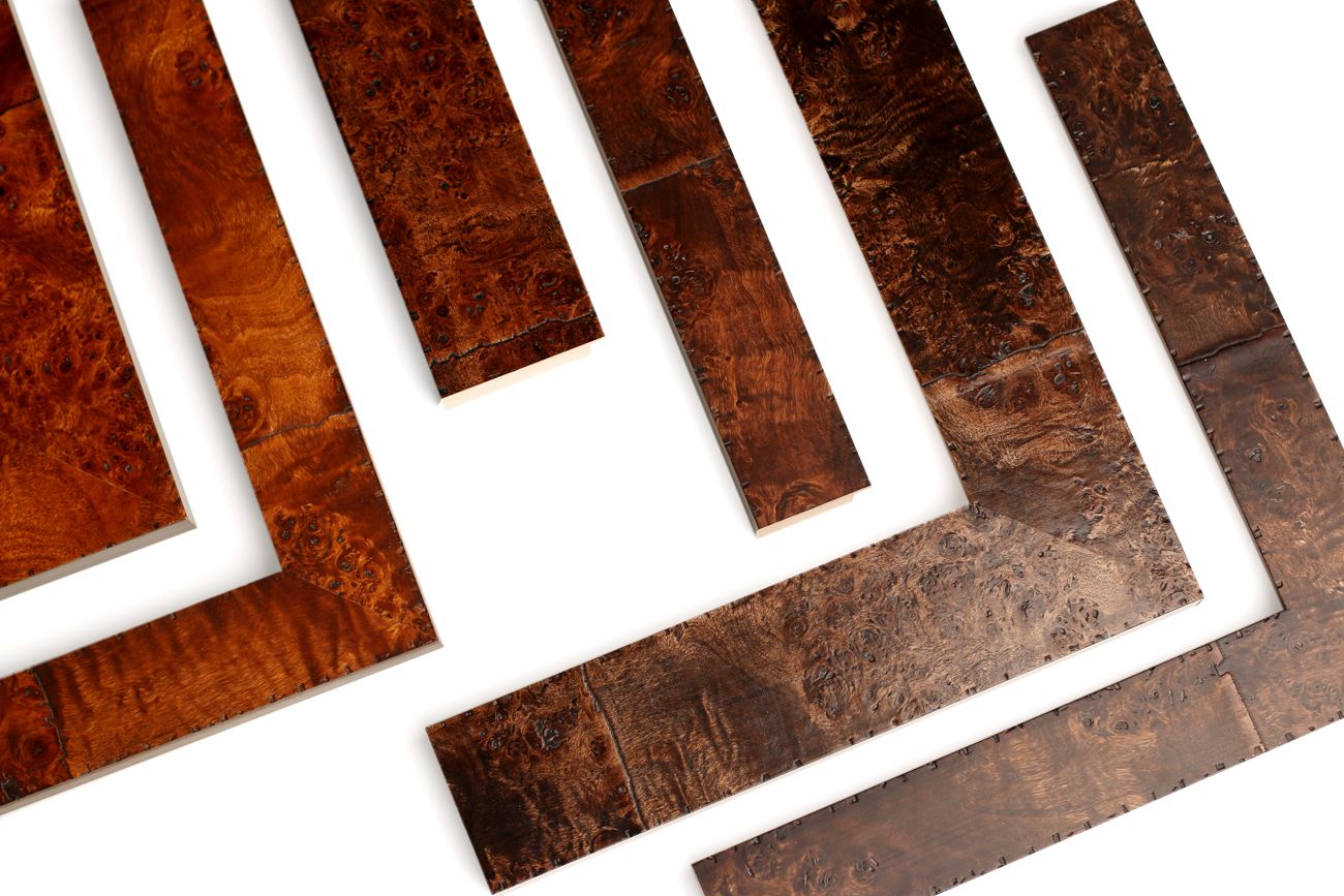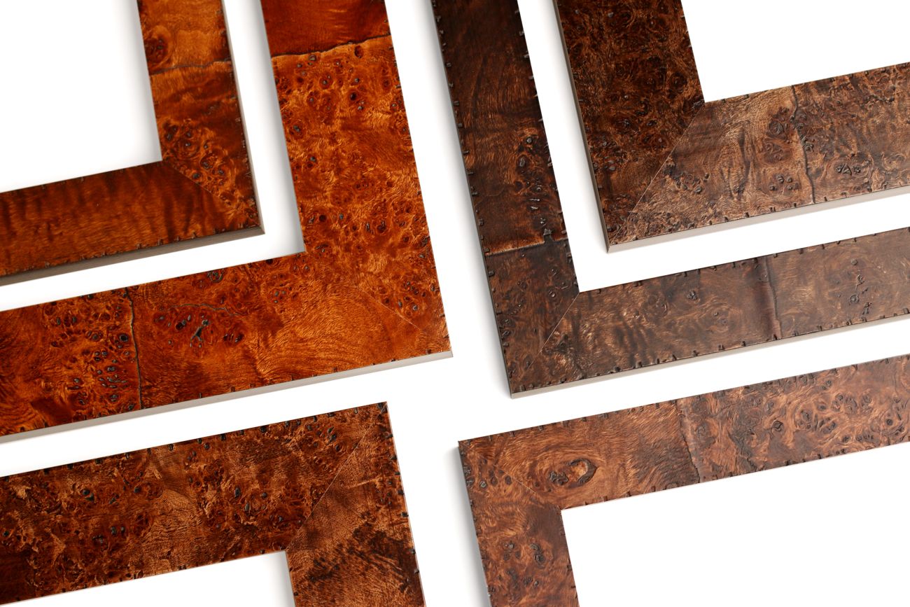 Nádherné rámy proto vznikají i díky použití ušlechtilých dýh z klasických, vzácných i exotických dřevin. Často využíváme i dýhy z kořenic, intarzie dřevěných vrstev nebo recyklované staré dřevo. Právě příklady všech těchto typů dřevěných rámů uvidíte v následující sekci inspirací a referencí našeho rámování v Praze.