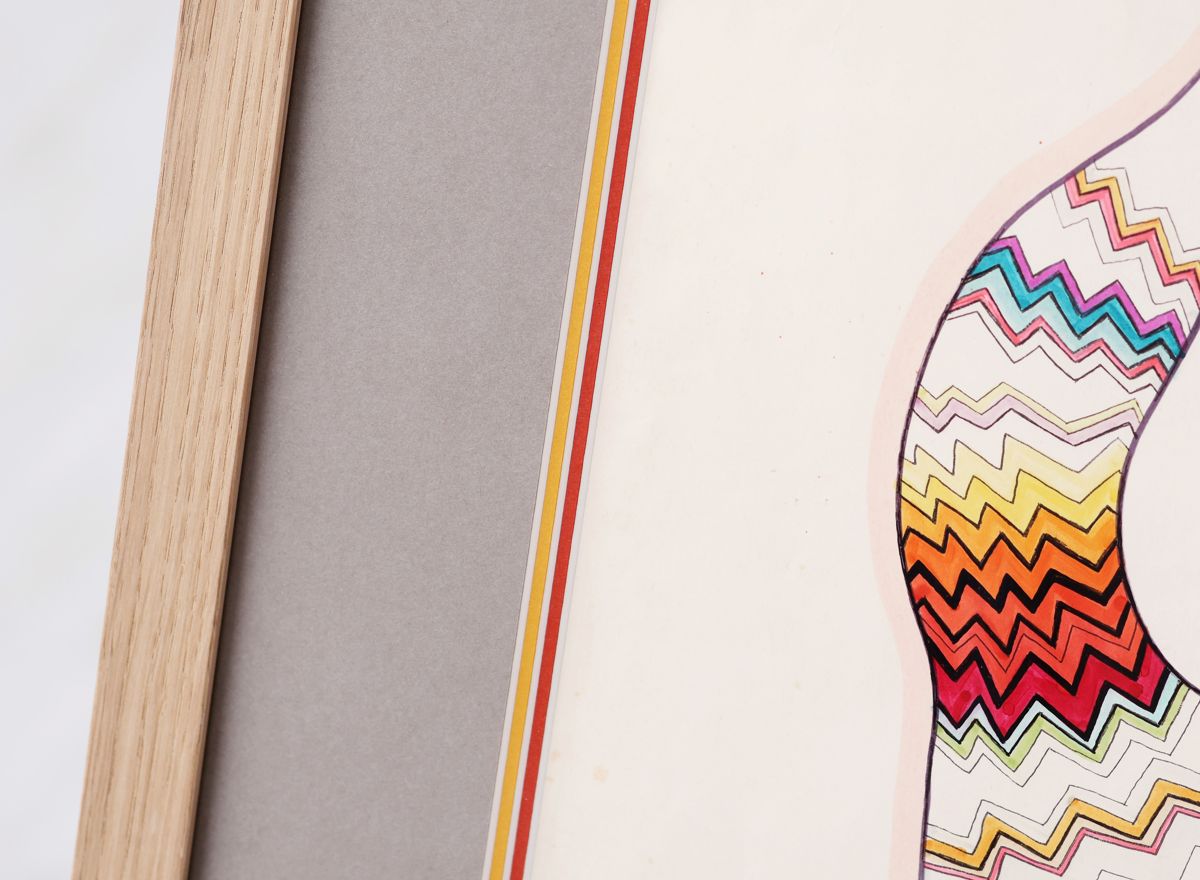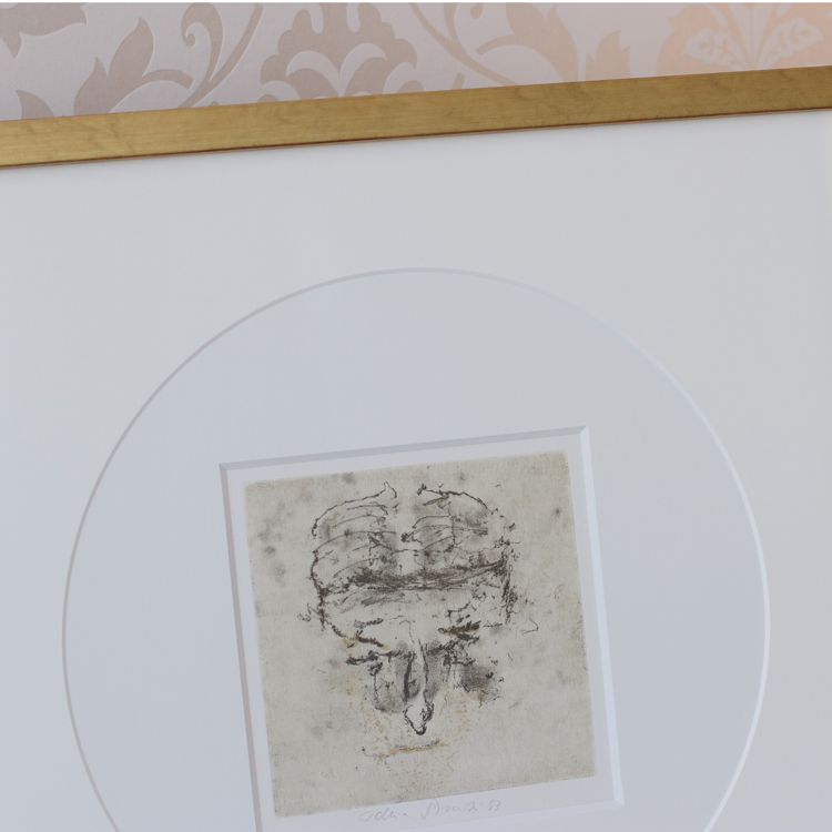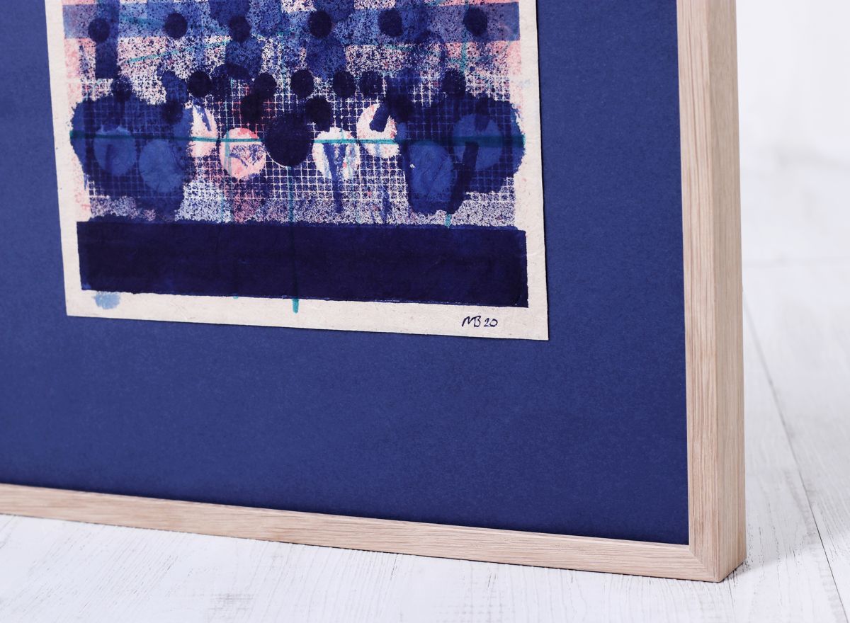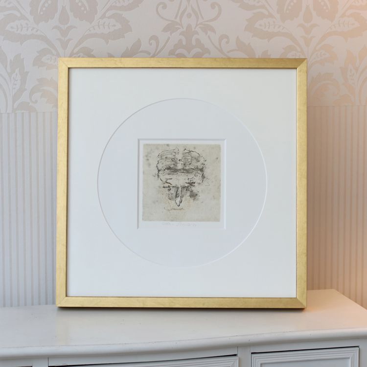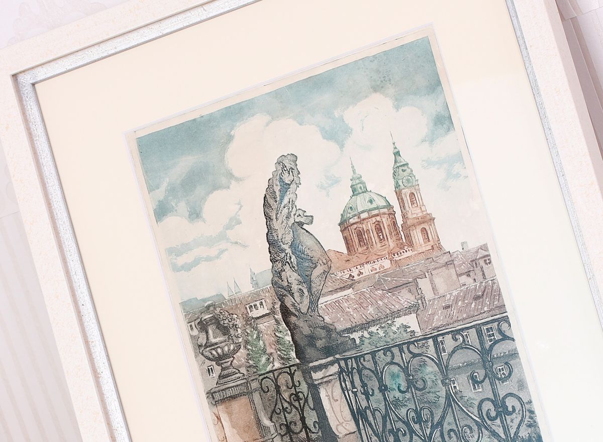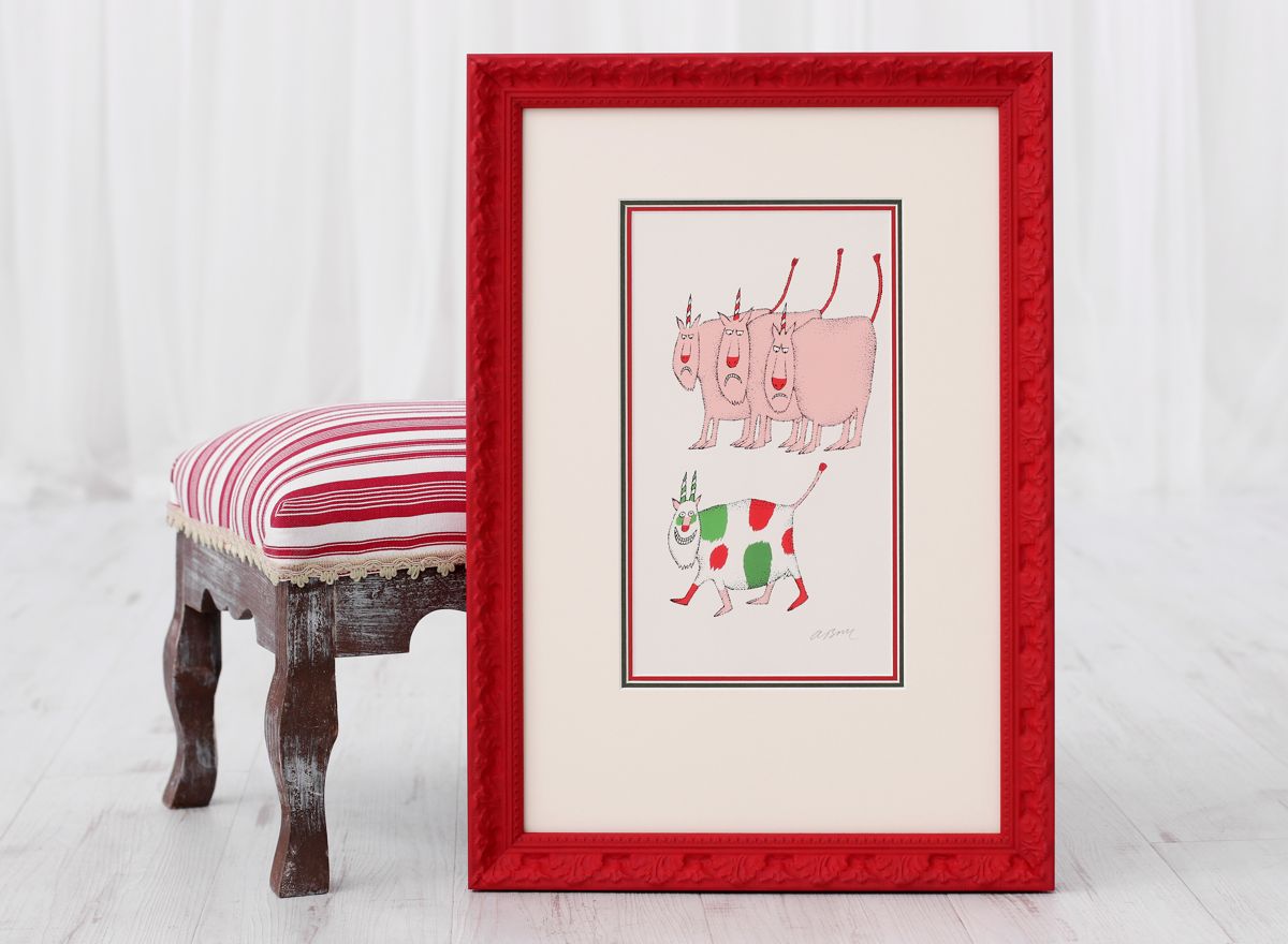 Plně jsme to využili při orámování serigrafie Adolfa Borna, kde vrstvení paspart v barvách korespondujících s tiskem pomáhá podtrhnout jeho živé barvy. Zvolili jsme moderně zpracovaný sytě červený rámeček s jemnými barokizujícími ornamenty, který tvoří působivý kontrast k Bornovým typickým postavičkám. Toto spojení dodává dílu moderní a zároveň nadčasový vzhled.