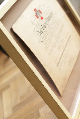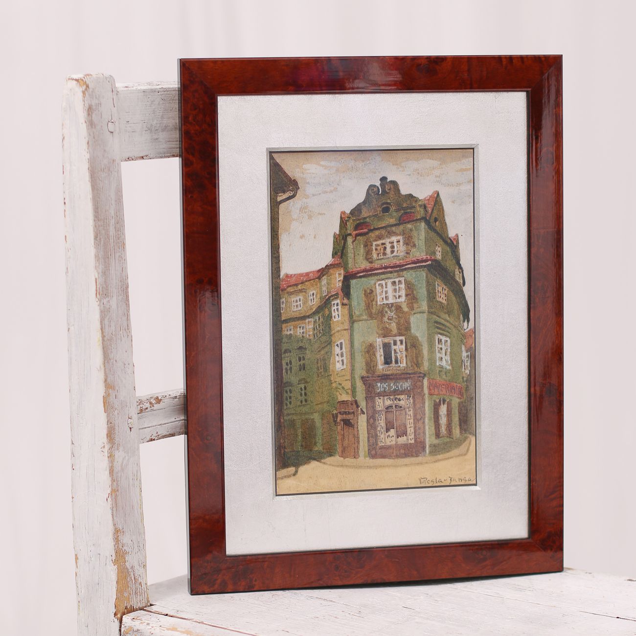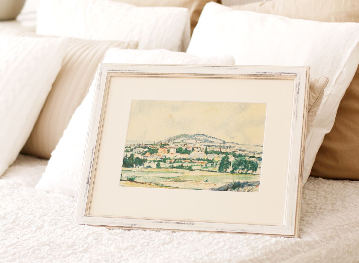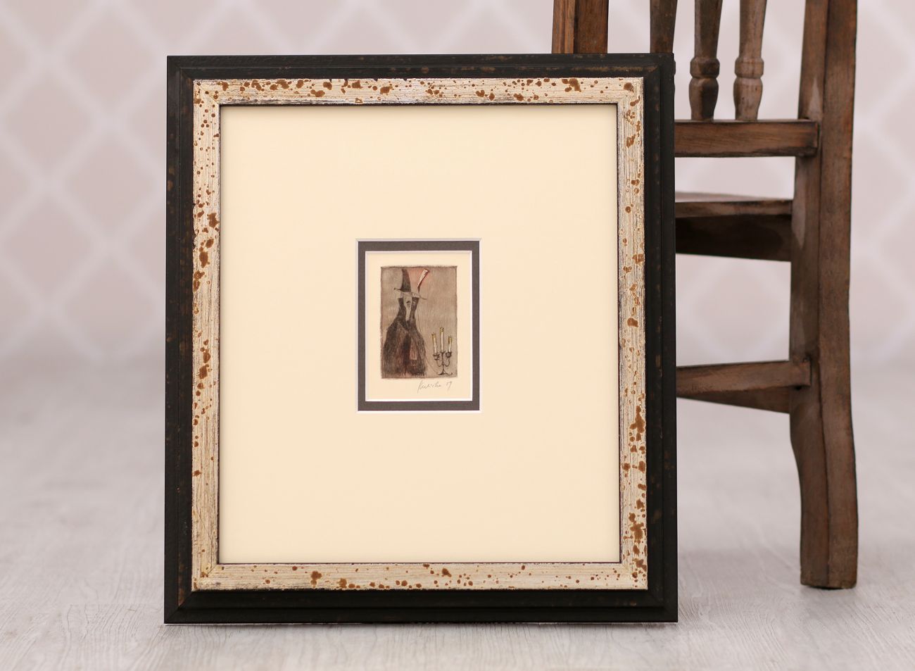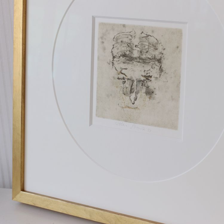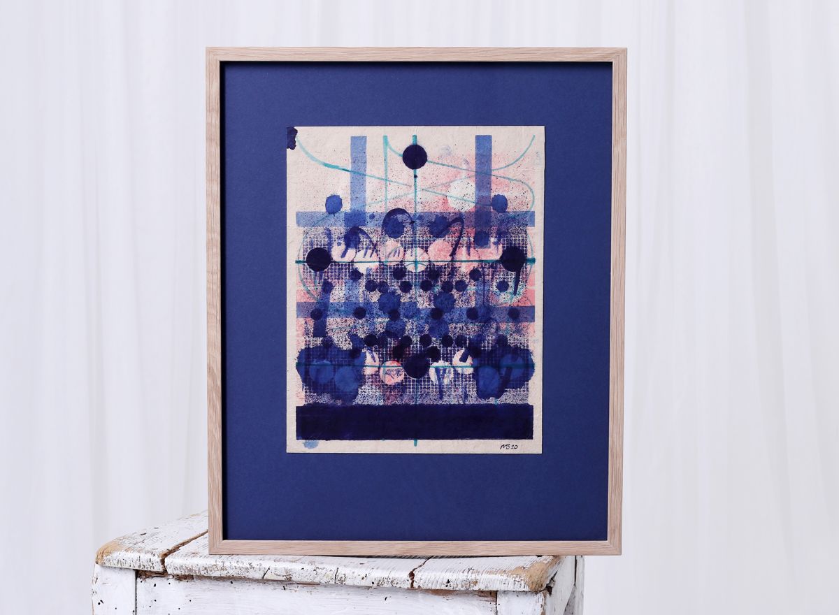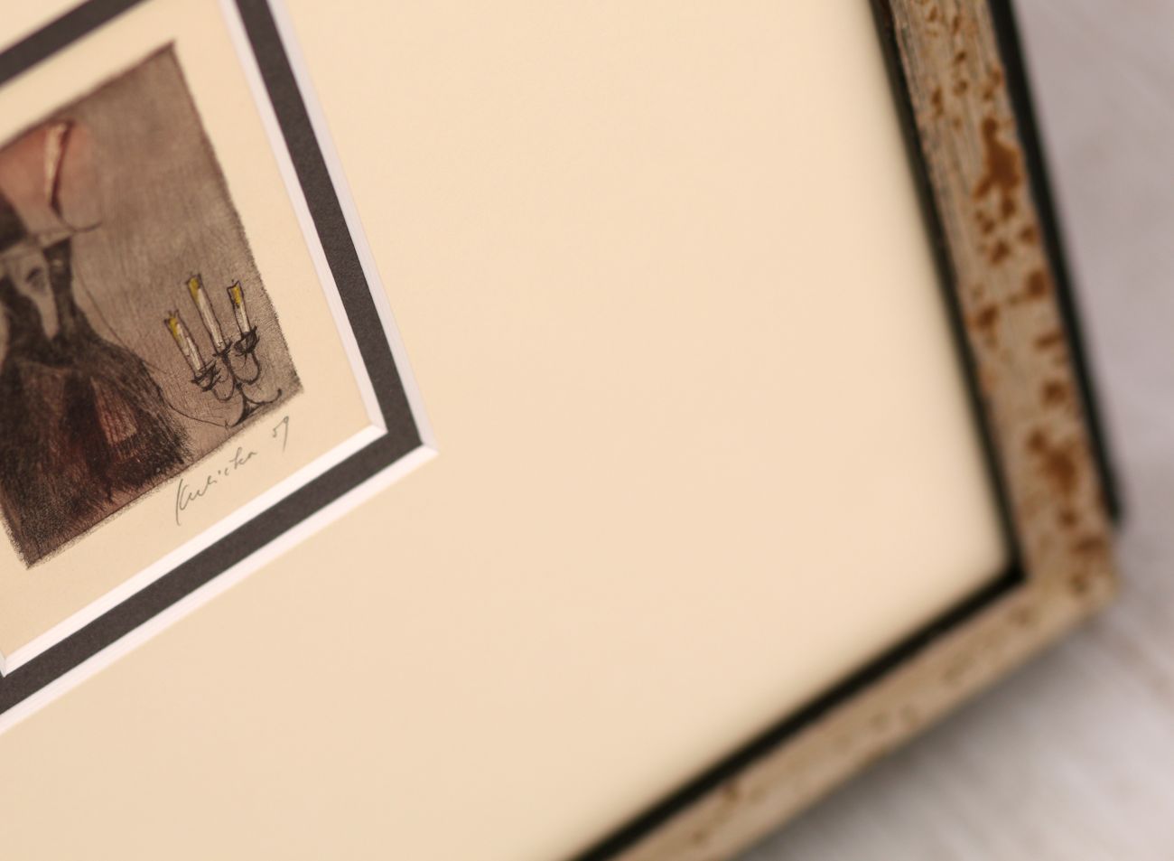 Plně jsme to využili při orámování serigrafie Adolfa Borna, kde vrstvení paspart v barvách korespondujících s tiskem pomáhá podtrhnout jeho živé barvy. Zvolili jsme moderně zpracovaný sytě červený rámeček s jemnými barokizujícími ornamenty, který tvoří působivý kontrast k Bornovým typickým postavičkám. Toto spojení dodává dílu moderní a zároveň nadčasový vzhled.