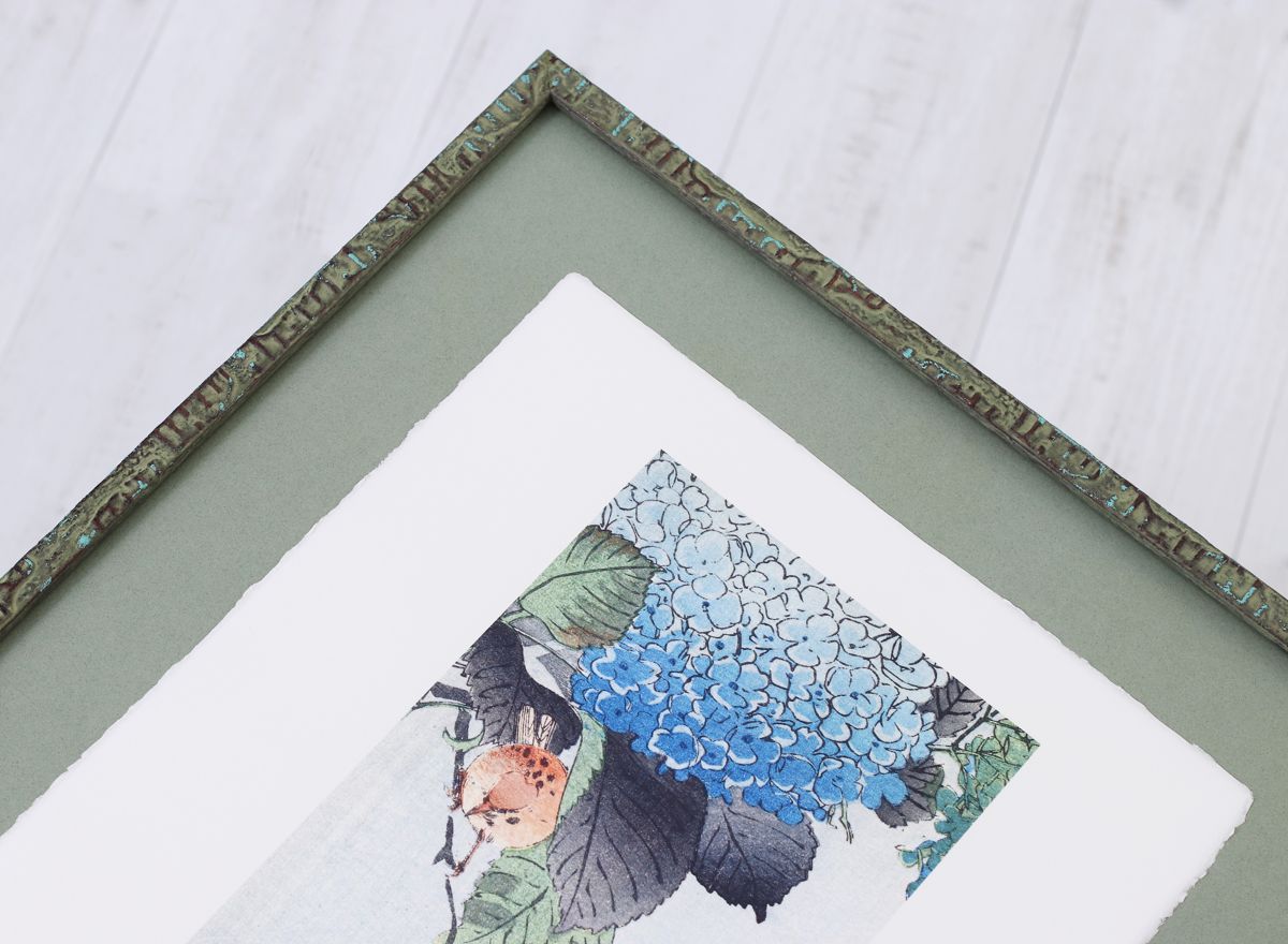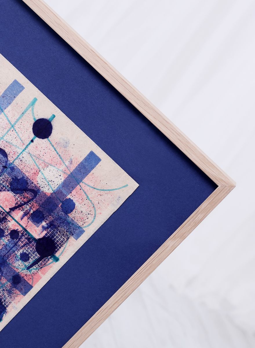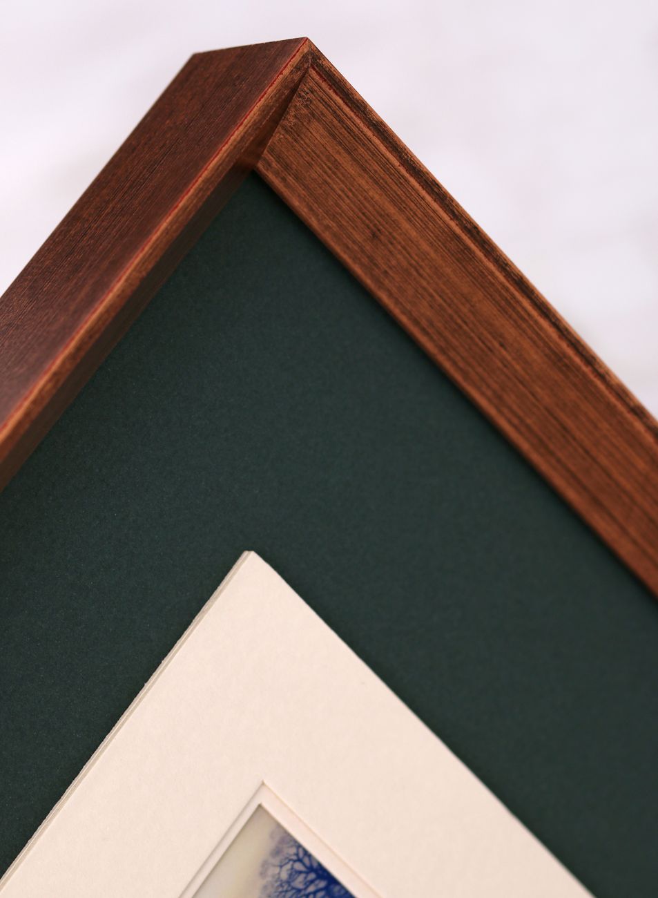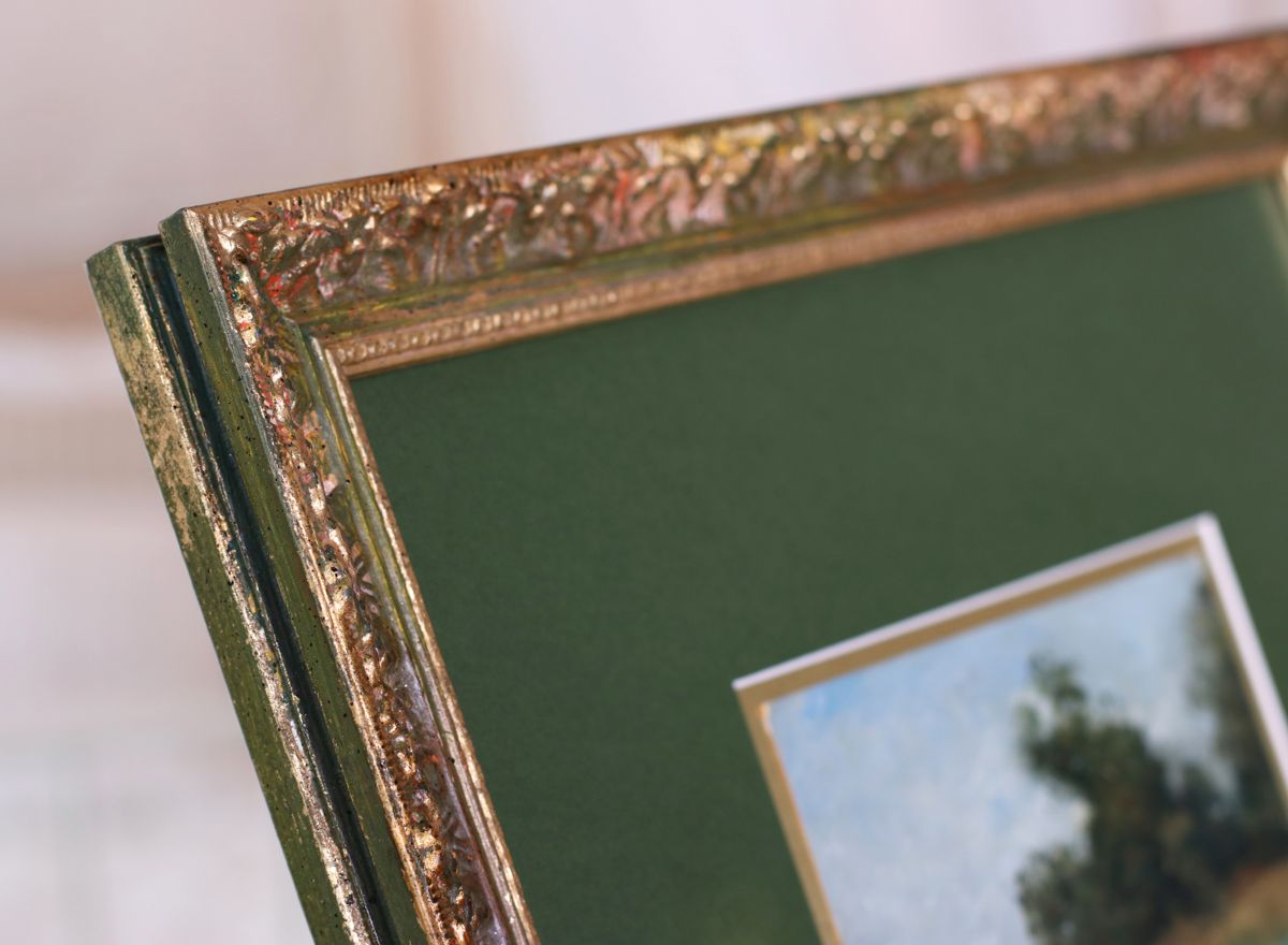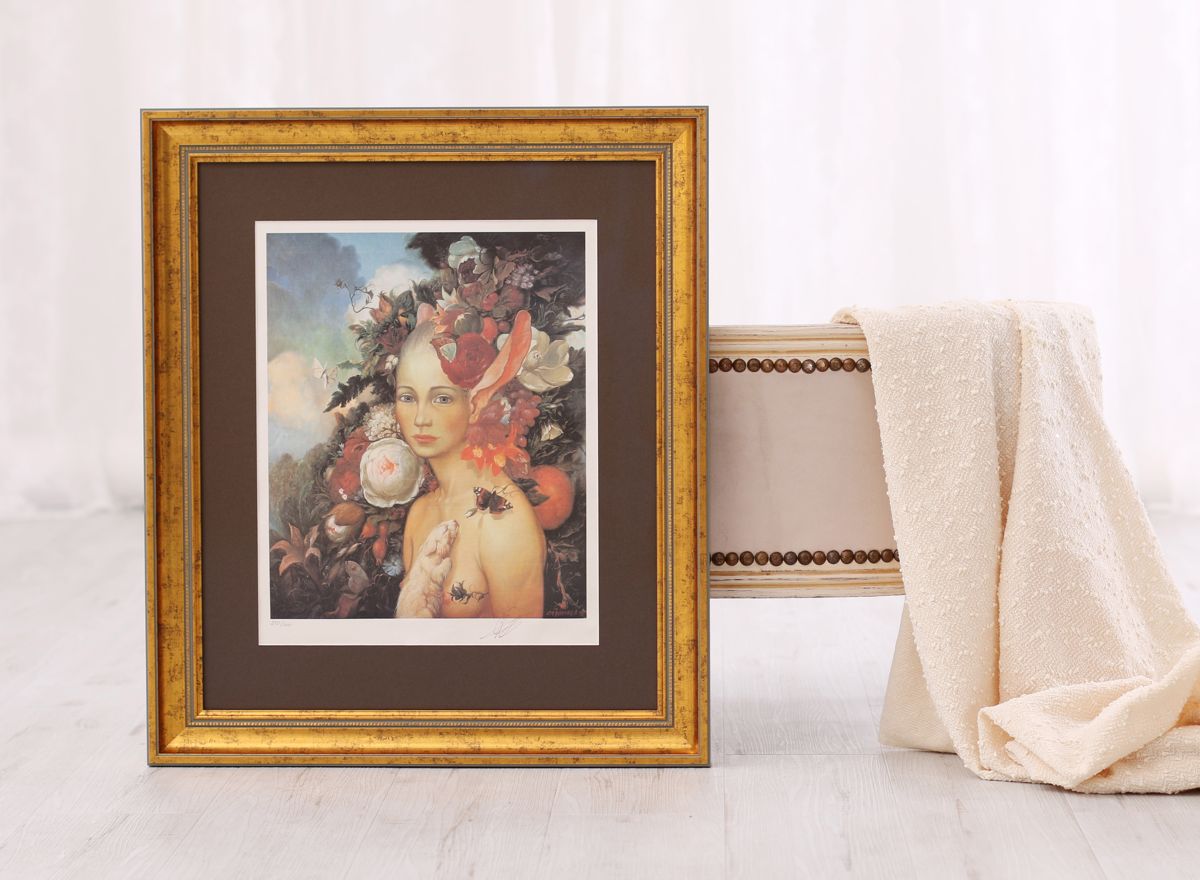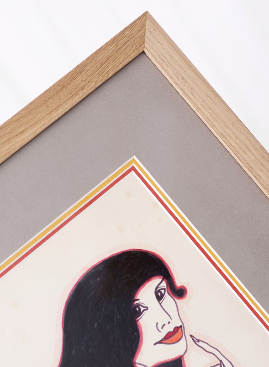 Klíčovou roli zde hraje trojice paspart. Spodní dvě, v sytých tónech červené a zelené, ladí s barvami tisku, zatímco svrchní pasparta v delikátním světle krémovém odstínu zjemňuje přechod k rámu a dodává obrazu hloubku.