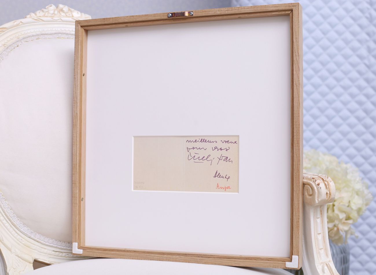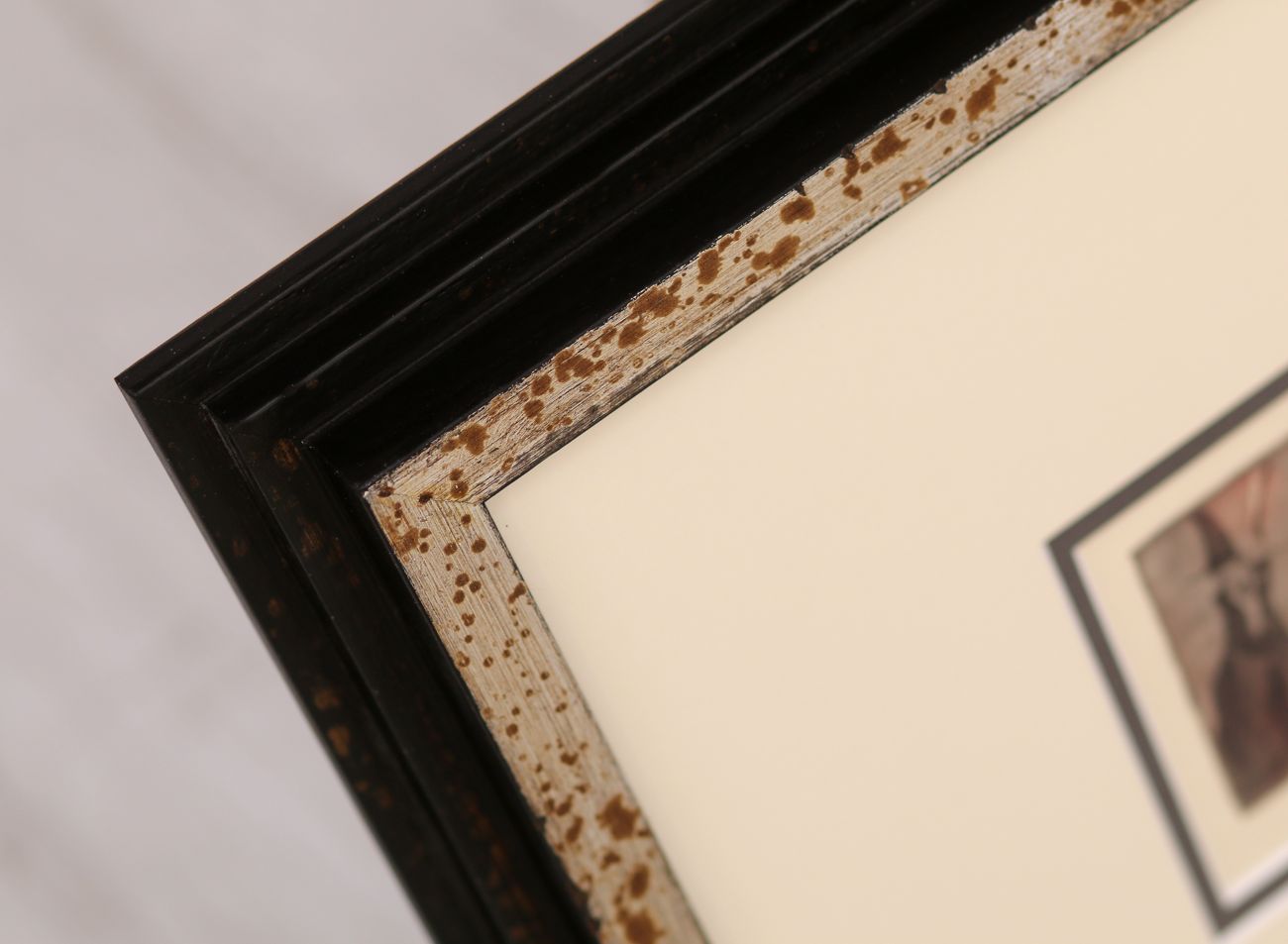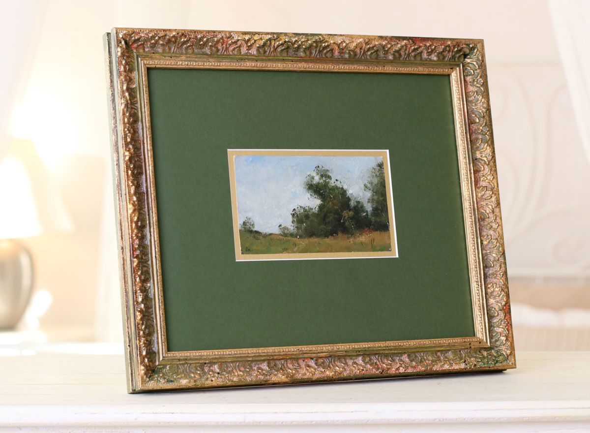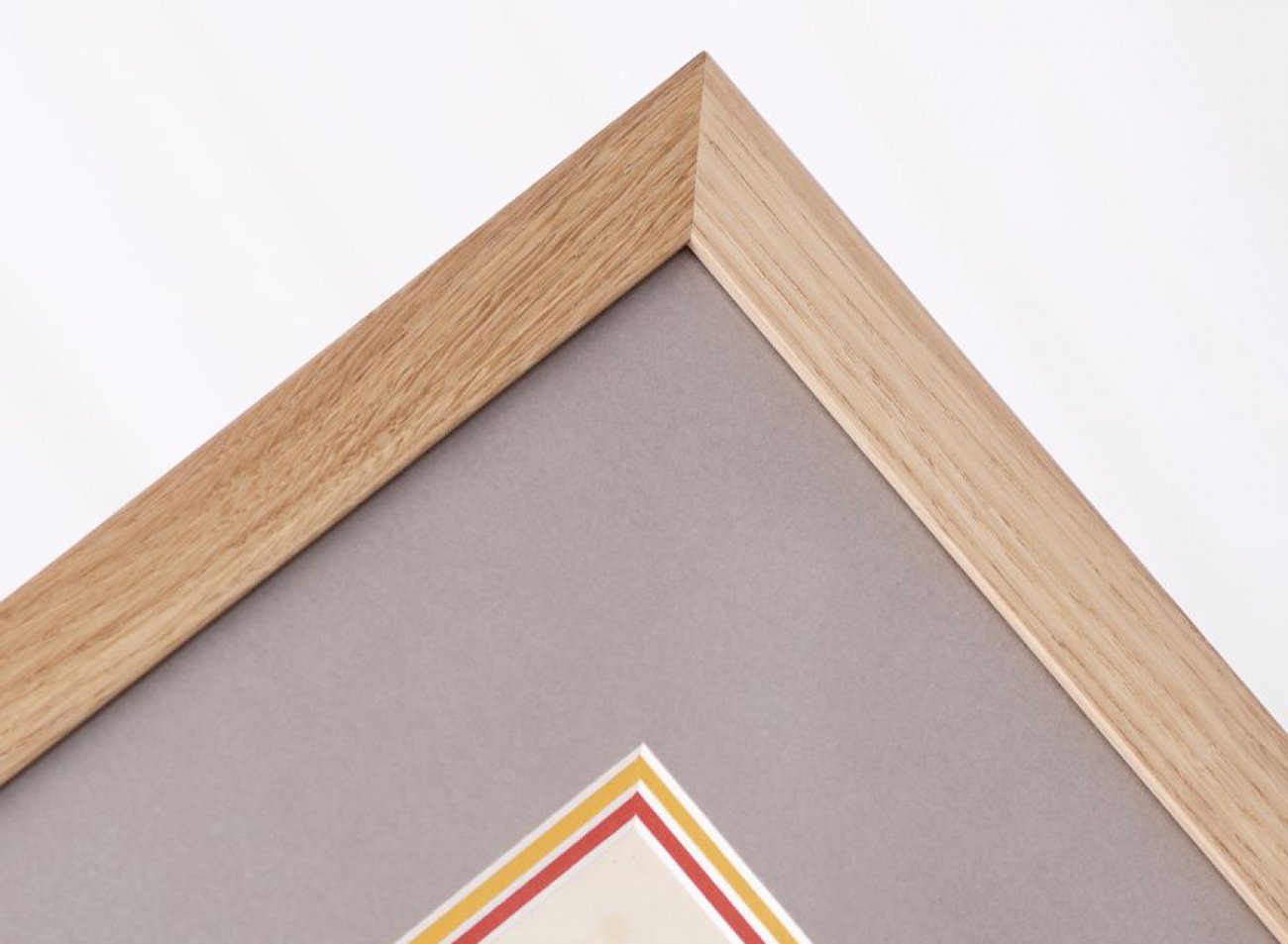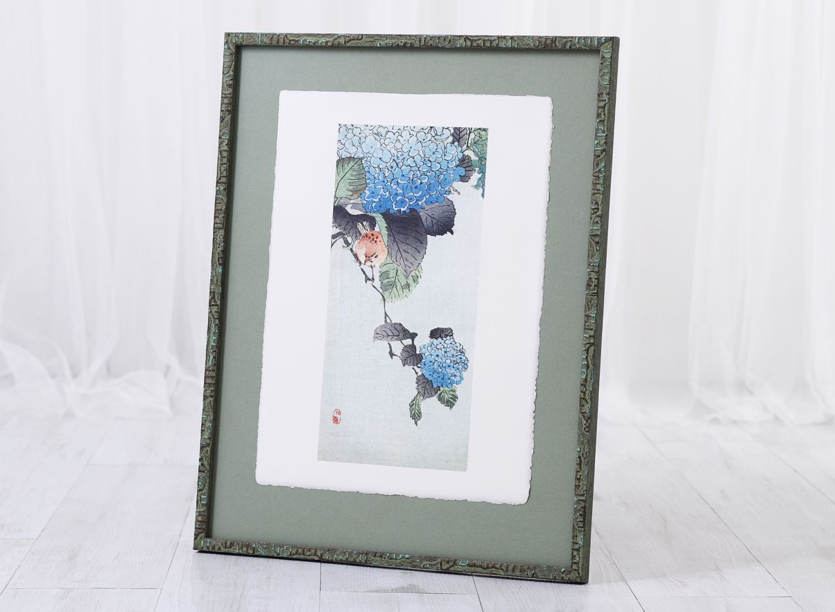 Klíčovou roli zde hraje trojice paspart. Spodní dvě, v sytých tónech červené a zelené, ladí s barvami tisku, zatímco svrchní pasparta v delikátním světle krémovém odstínu zjemňuje přechod k rámu a dodává obrazu hloubku.
