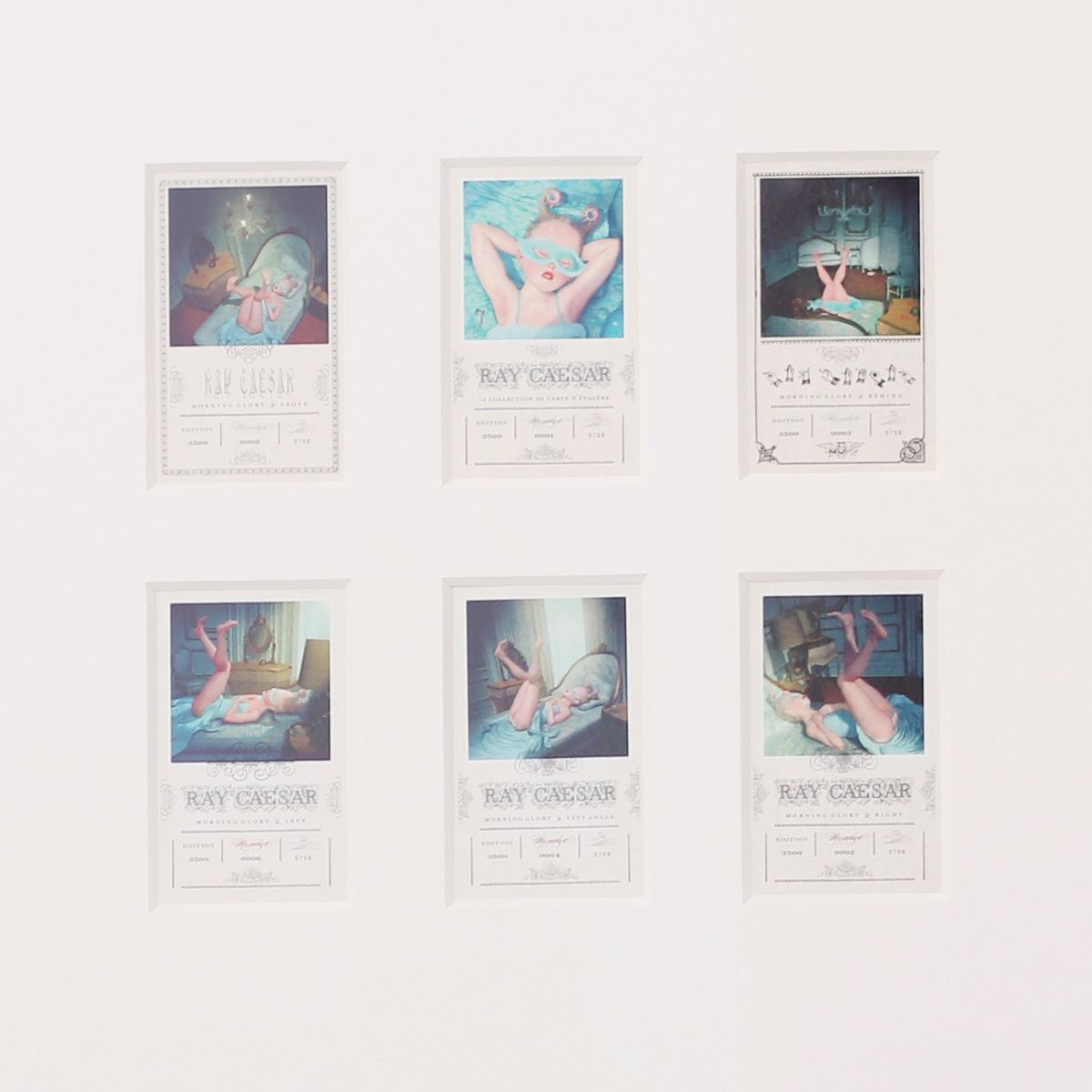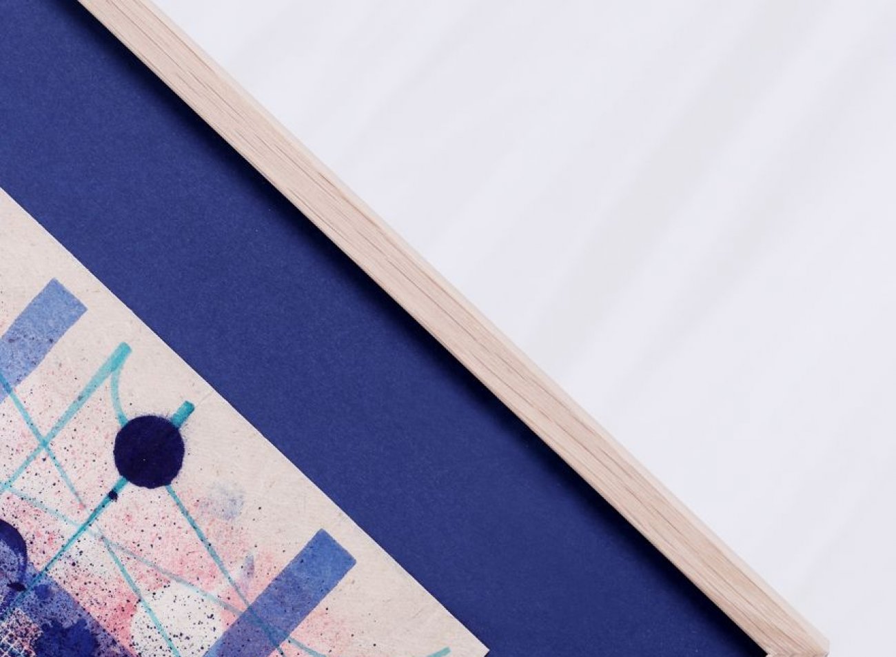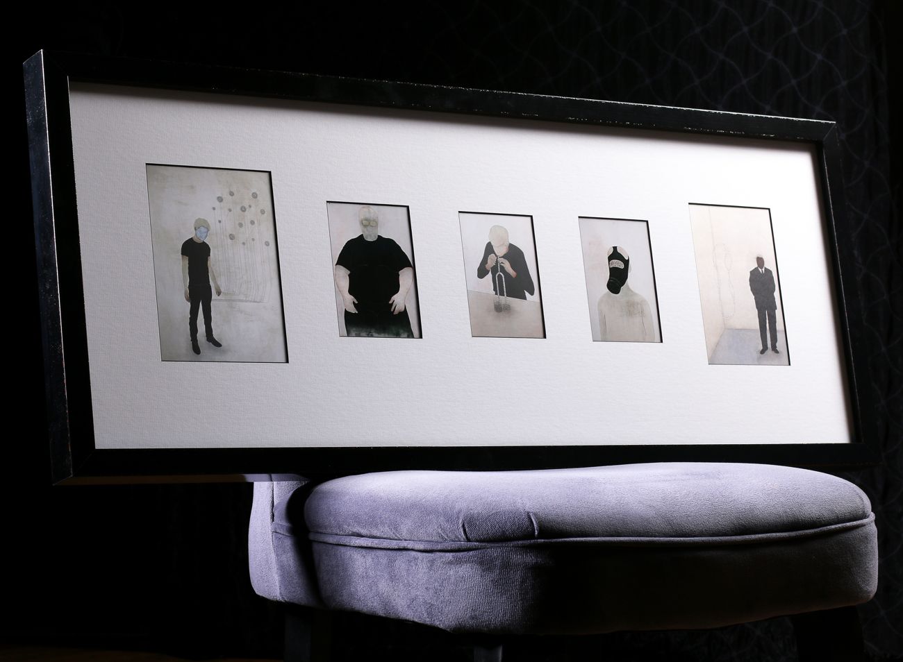 Pasparty mohou mít i více výřezů, v tomto případě jich je pět, paspartová „okénka“ navíc nejsou stejně velká. Samotný paspartovací karton je rovněž velmi zajímavý - bílá vrchní vrstva je položena na černém jádru pasparty a díky tomu má černý šikmý výřez. Ten zarámovanému obrazu dodává výjimečnou dynamiku a nabíjí jej velkou energií.