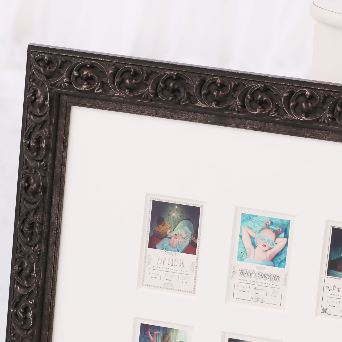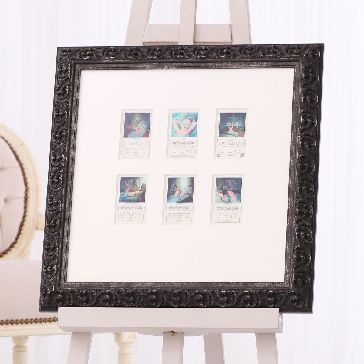 V tomto případě je v jediném rámu pět moderních černobílých pohlednic od jediného autora a tvoří tak krásný obraz – koláž. Pohlednice jsou v moderním černém rámu a všechny jsou umístěné v jediné paspartě.