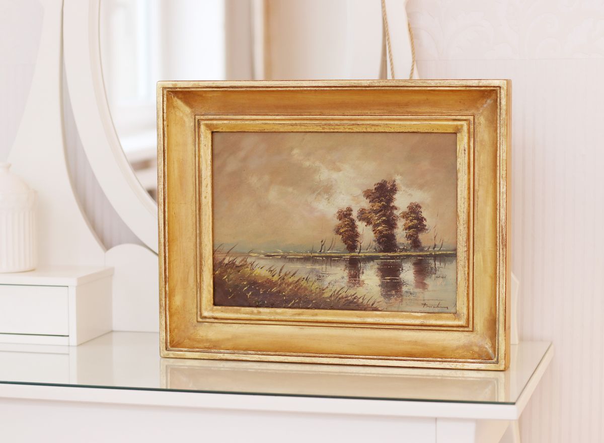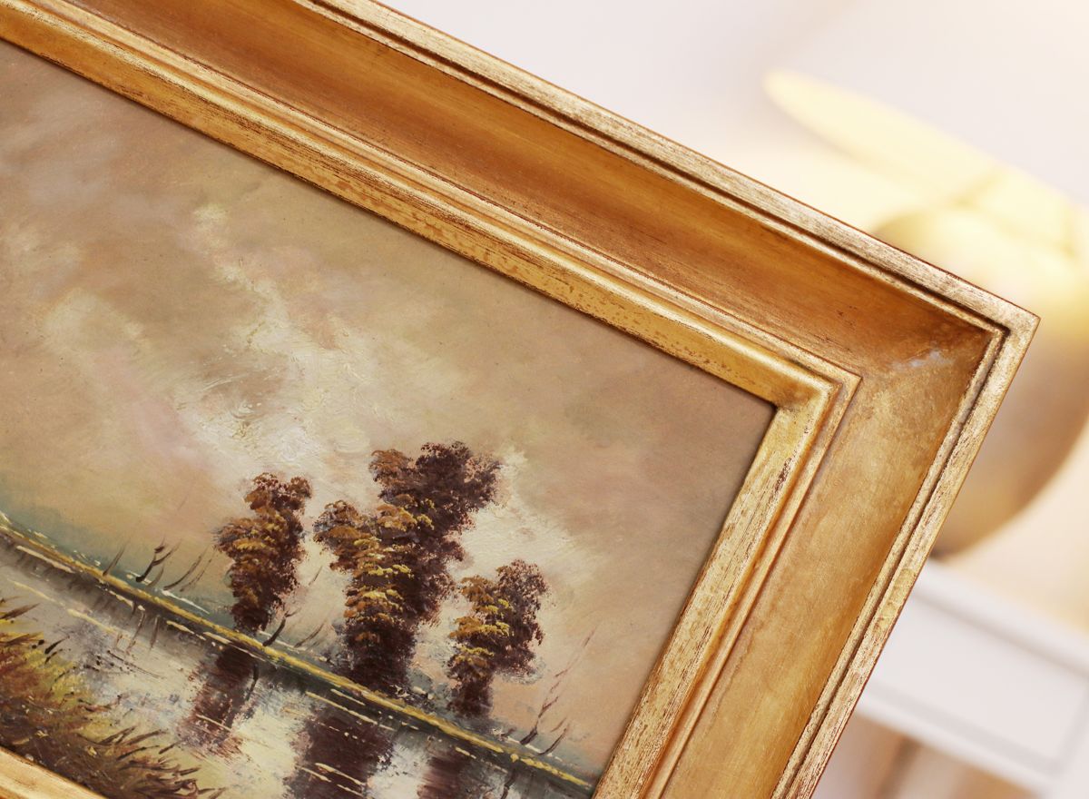 Obrazu samotnému tedy stačilo jen jednoduché povrchové čištění, aby krajina s řekou opět prokoukla. Zcela jsme změnili styl i barevnost rámu. Vybrali jsme sice opět vysoce kvalitní modelový rám, který je stejně jako původní rám vyroben ručně zcela na zakázku, má pěkné uzavřené rohy a padnoucí patinu, nicméně rám nemá rušivé ornamenty a barevně obraz výborně podpoří. Výsledek je díky tomu mnohem výraznější a obraz ve svém důsledku působí mnohem důležitěji.